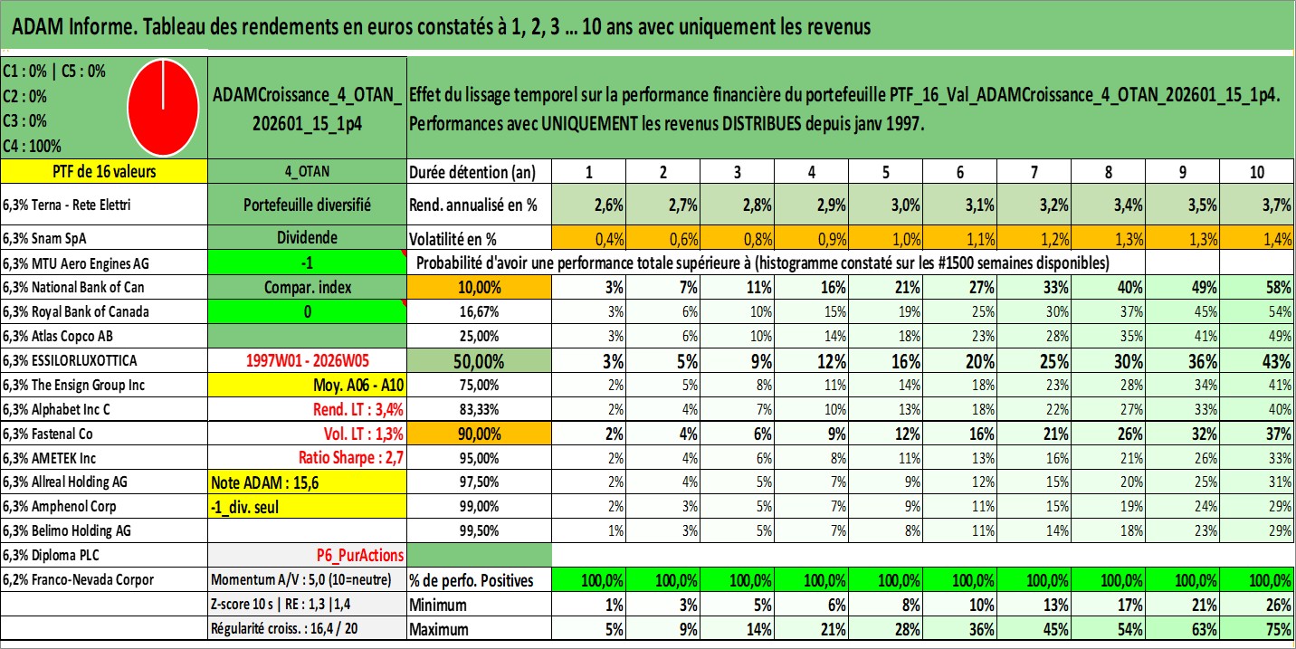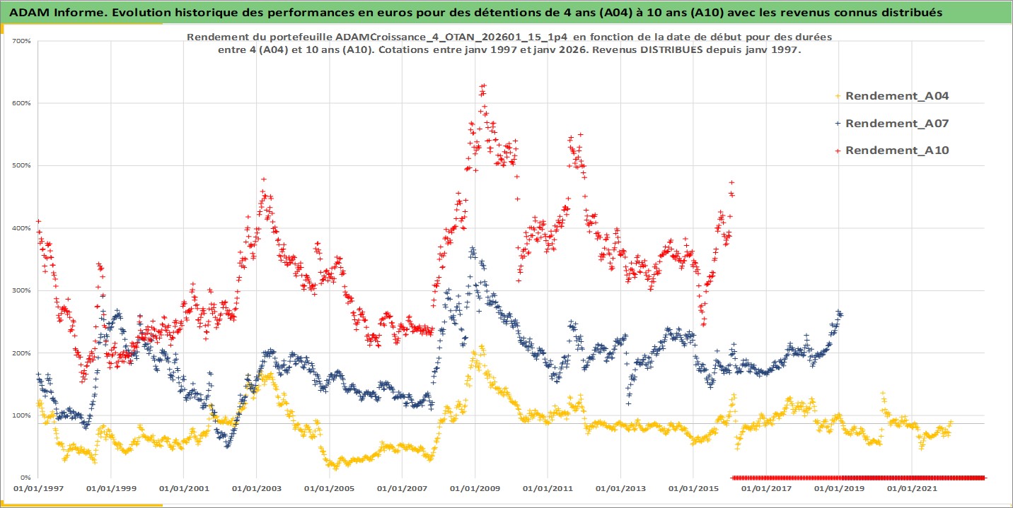 Site dédié aux investisseursPage dédiée sur site financeAnalyse des valorisations hebdomadaires du portefeuille ADAMCroissance_4_OTAN_202601_15_1p4_16actifs avec un profil P6_PurActions. Ce portefeuille est cote en EUR. Les valorisations couvrent les semaines 1997W01 a 2026W05. Les revenus de cet actif financier sont pris en compte depuis la semaine 1997W01. La note globale ESG de cet actif est estimee a 11.4 (apres rebasage entre 0 et 20).