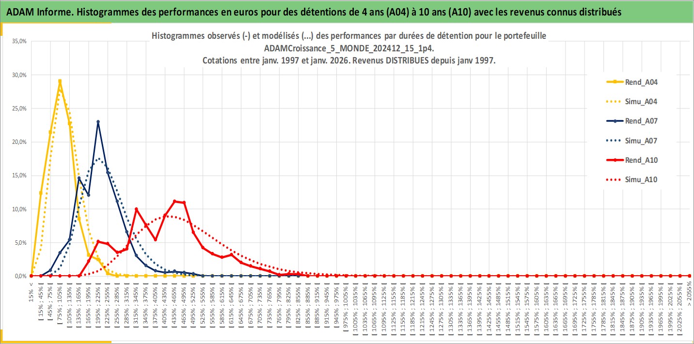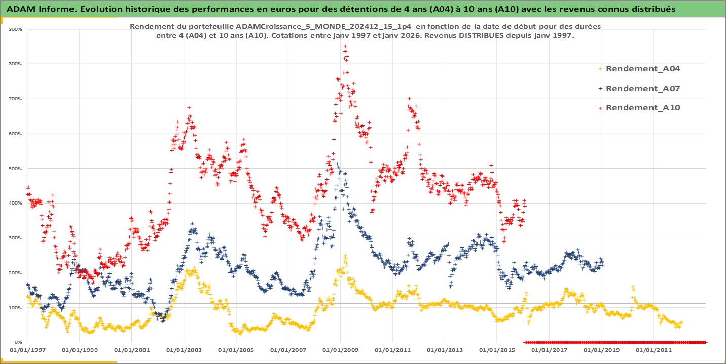 Site dédié aux investisseursPage dédiée sur site financeAnalyse des valorisations hebdomadaires du portefeuille ADAMCroissance_5_MONDE_202412_15_1p4_47actifs avec un profil P6_PurActions. Ce portefeuille est cote en EUR. Les valorisations couvrent les semaines 1997W01 a 2026W05. Les revenus de cet actif financier sont pris en compte depuis la semaine 1997W01. La note globale ESG de cet actif est estimee a 11.0 (apres rebasage entre 0 et 20).