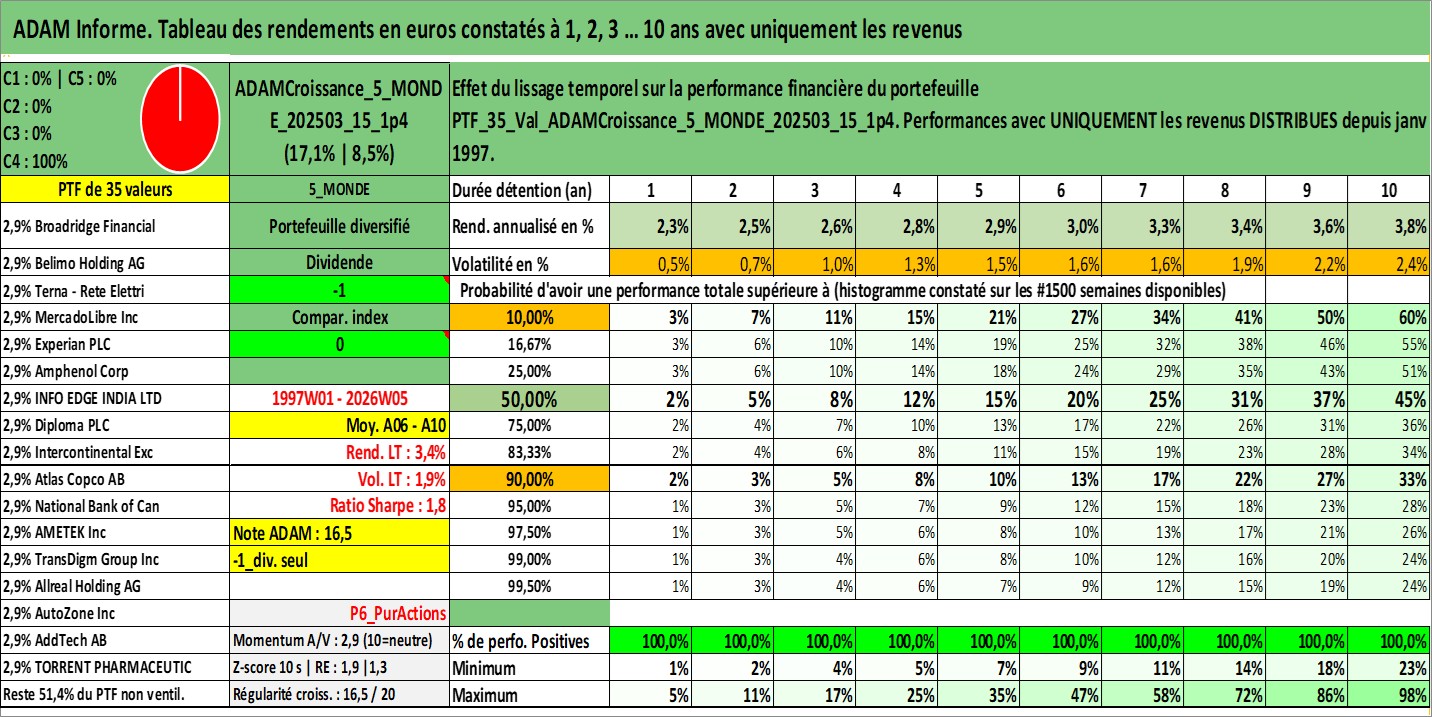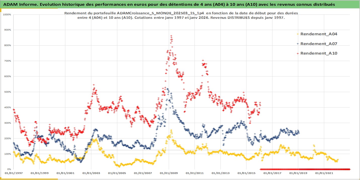 Site dédié aux investisseursPage dédiée sur site financeAnalyse des valorisations hebdomadaires du portefeuille ADAMCroissance_5_MONDE_202503_15_1p4_35actifs avec un profil P6_PurActions. Ce portefeuille est cote en EUR. Les valorisations couvrent les semaines 1997W01 a 2026W05. Les revenus de cet actif financier sont pris en compte depuis la semaine 1997W01. La note globale ESG de cet actif est estimee a 10.9 (apres rebasage entre 0 et 20).