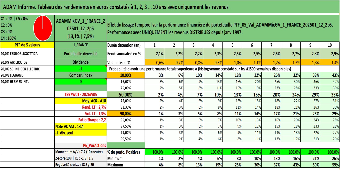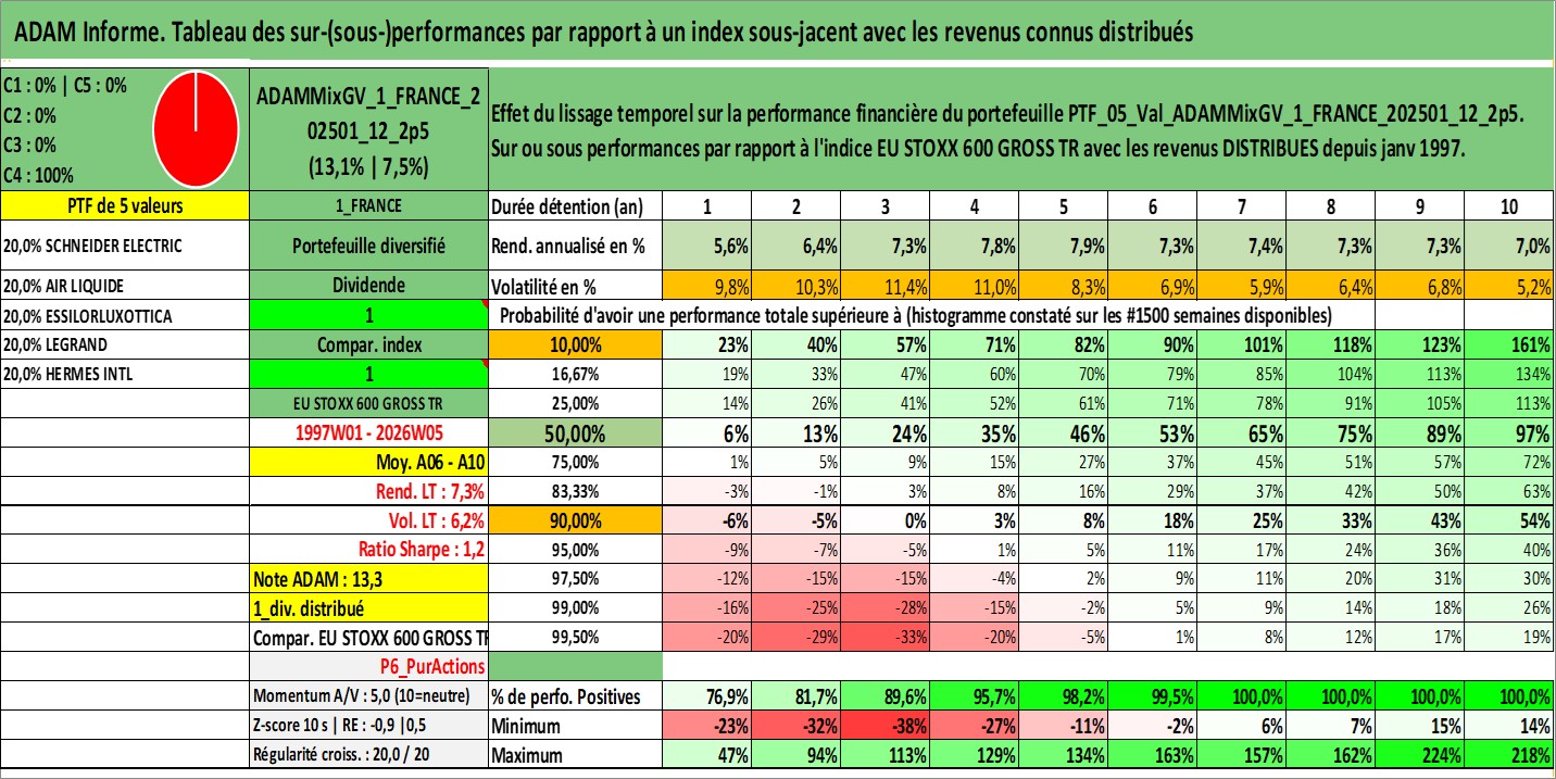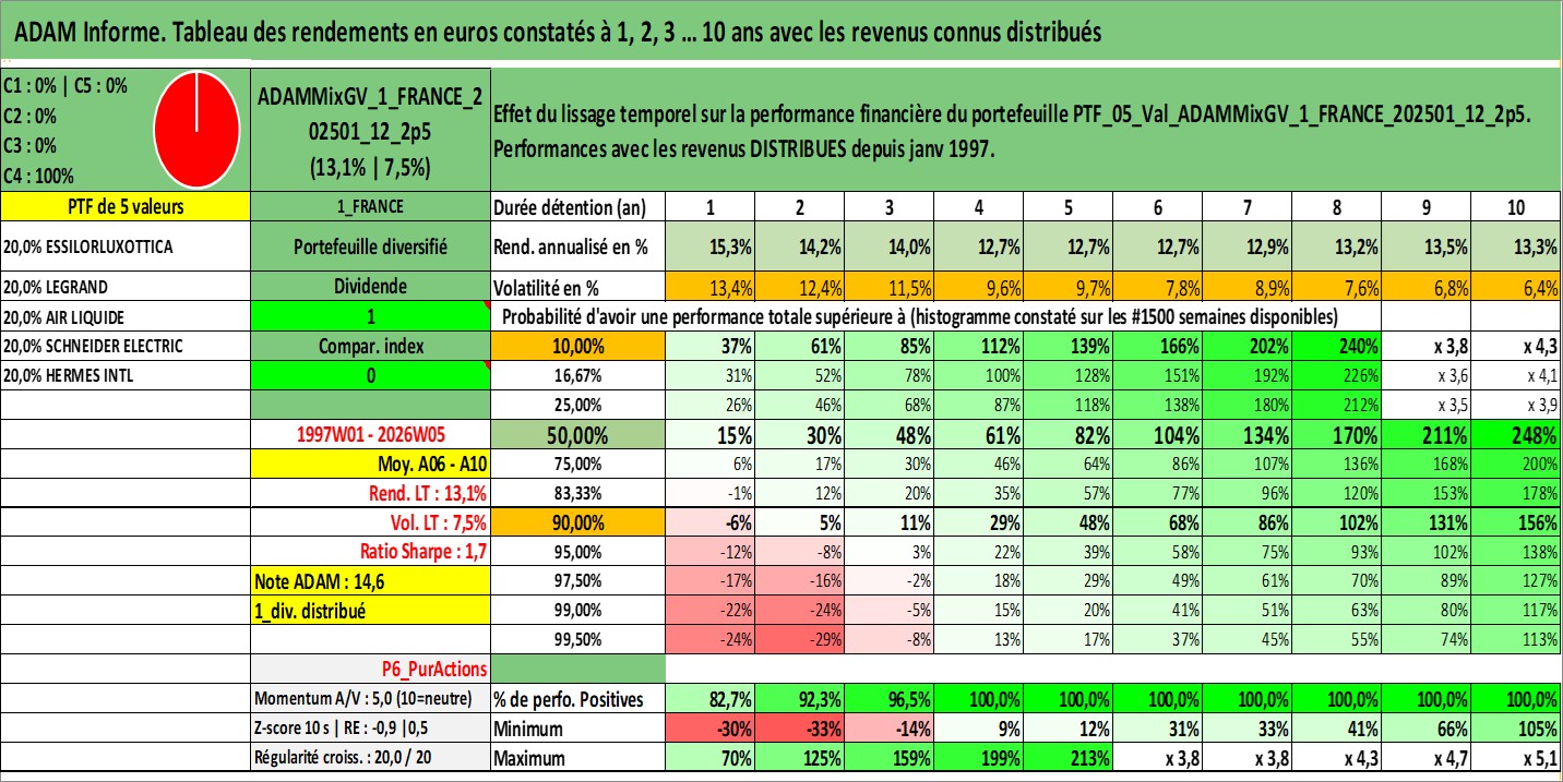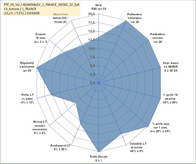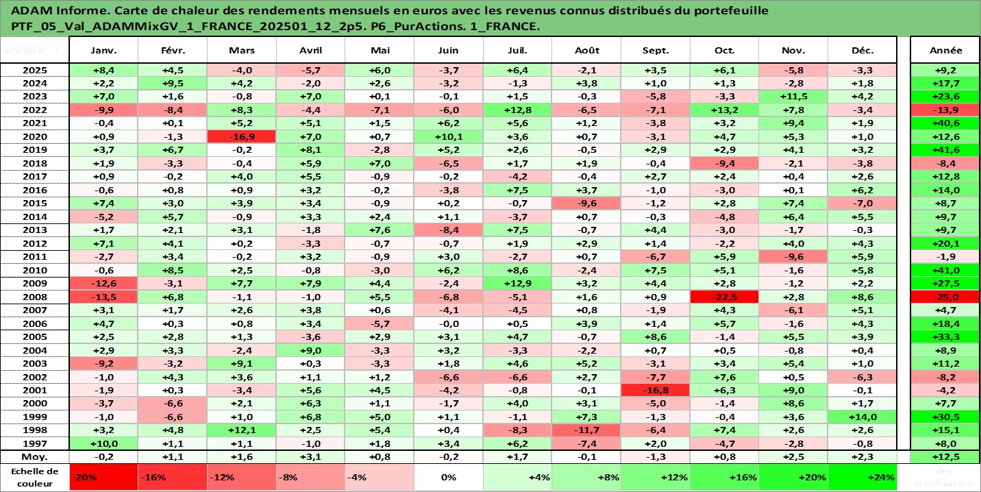 Site dédié aux investisseursPage dédiée sur site financeAnalyse des valorisations hebdomadaires du portefeuille ADAMMixGV_1_FRANCE_202501_12_2p5_5actifs avec un profil P6_PurActions. Ce portefeuille est cote en EUR. Les valorisations couvrent les semaines 1997W01 a 2026W05. Les revenus de cet actif financier sont pris en compte depuis la semaine 1997W01. La note globale ESG de cet actif est estimee a 13.2 (apres rebasage entre 0 et 20).