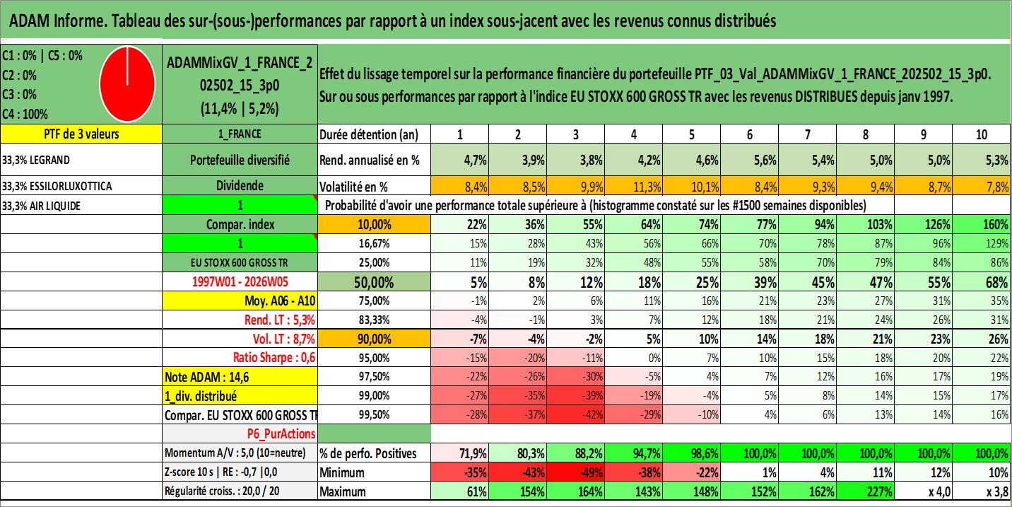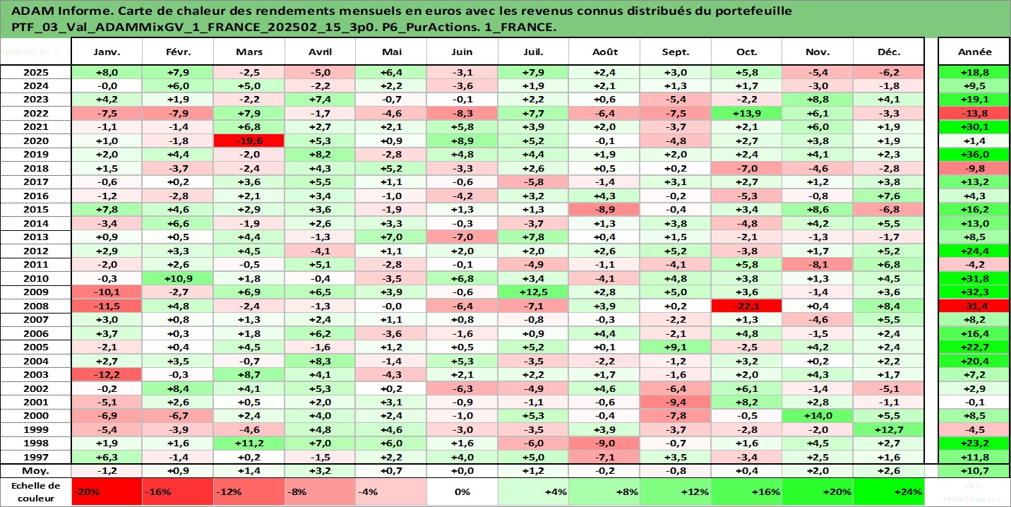 Site dédié aux investisseursPage dédiée sur site financeAnalyse des valorisations hebdomadaires du portefeuille ADAMMixGV_1_FRANCE_202502_15_3p0_3actifs avec un profil P6_PurActions. Ce portefeuille est cote en EUR. Les valorisations couvrent les semaines 1997W01 a 2026W05. Les revenus de cet actif financier sont pris en compte depuis la semaine 1997W01. La note globale ESG de cet actif est estimee a 12.3 (apres rebasage entre 0 et 20).