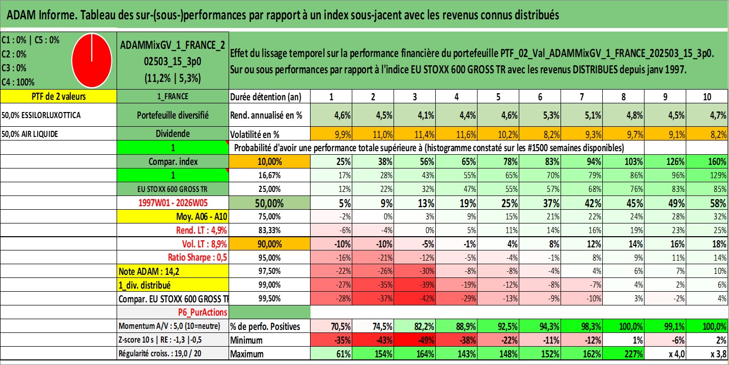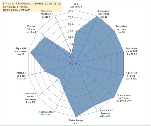 Site dédié aux investisseursPage dédiée sur site financeAnalyse des valorisations hebdomadaires du portefeuille ADAMMixGV_1_FRANCE_202503_15_3p0_2actifs avec un profil P6_PurActions. Ce portefeuille est cote en EUR. Les valorisations couvrent les semaines 1997W01 a 2026W05. Les revenus de cet actif financier sont pris en compte depuis la semaine 1997W01. La note globale ESG de cet actif est estimee a 12.0 (apres rebasage entre 0 et 20).