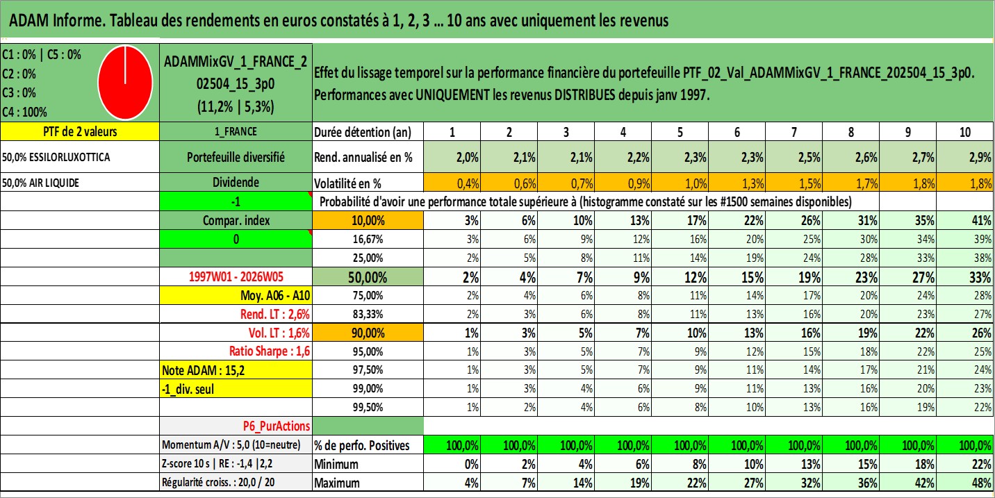 Site dédié aux investisseursPage dédiée sur site financeAnalyse des valorisations hebdomadaires du portefeuille ADAMMixGV_1_FRANCE_202504_15_3p0_2actifs avec un profil P6_PurActions. Ce portefeuille est cote en EUR. Les valorisations couvrent les semaines 1997W01 a 2026W05. Les revenus de cet actif financier sont pris en compte depuis la semaine 1997W01. La note globale ESG de cet actif est estimee a 12.0 (apres rebasage entre 0 et 20).