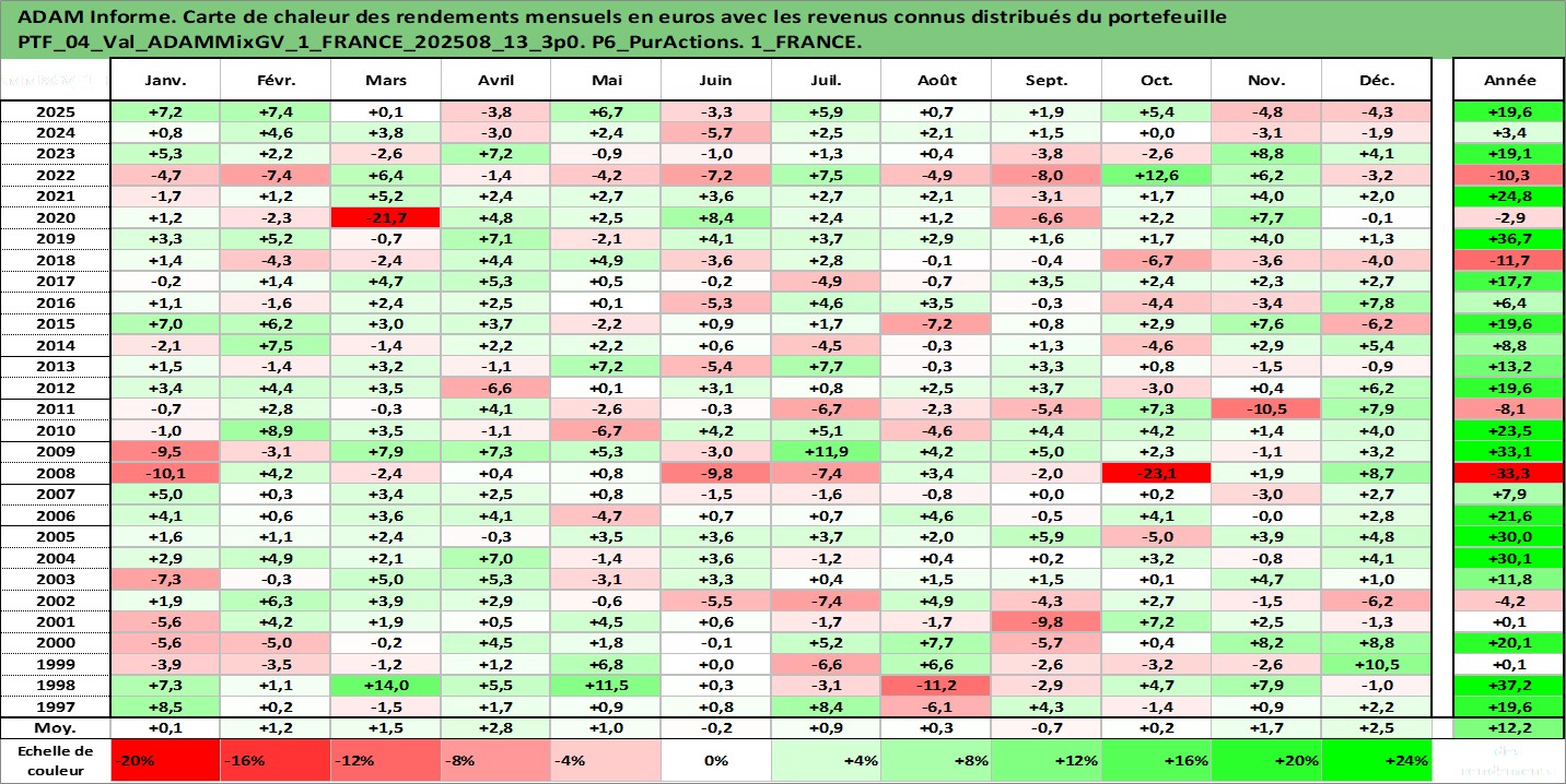 Site dédié aux investisseursPage dédiée sur site financeAnalyse des valorisations hebdomadaires du portefeuille ADAMMixGV_1_FRANCE_202508_13_3p0_4actifs avec un profil P6_PurActions. Ce portefeuille est cote en EUR. Les valorisations couvrent les semaines 1997W01 a 2026W05. Les revenus de cet actif financier sont pris en compte depuis la semaine 1997W01. La note globale ESG de cet actif est estimee a 11.0 (apres rebasage entre 0 et 20).