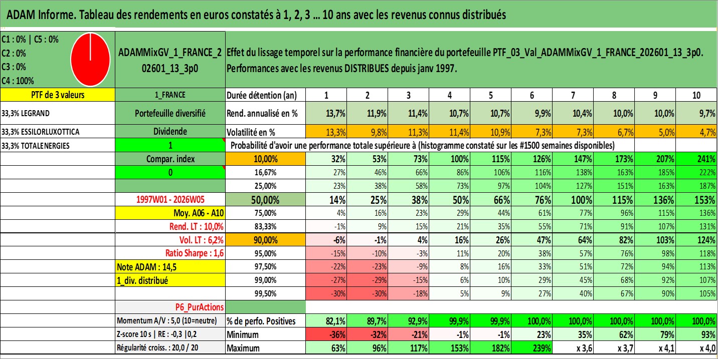 Site dédié aux investisseursPage dédiée sur site financeAnalyse des valorisations hebdomadaires du portefeuille ADAMMixGV_1_FRANCE_202601_13_3p0_3actifs avec un profil P6_PurActions. Ce portefeuille est cote en EUR. Les valorisations couvrent les semaines 1997W01 a 2026W05. Les revenus de cet actif financier sont pris en compte depuis la semaine 1997W01. La note globale ESG de cet actif est estimee a 9.3 (apres rebasage entre 0 et 20).