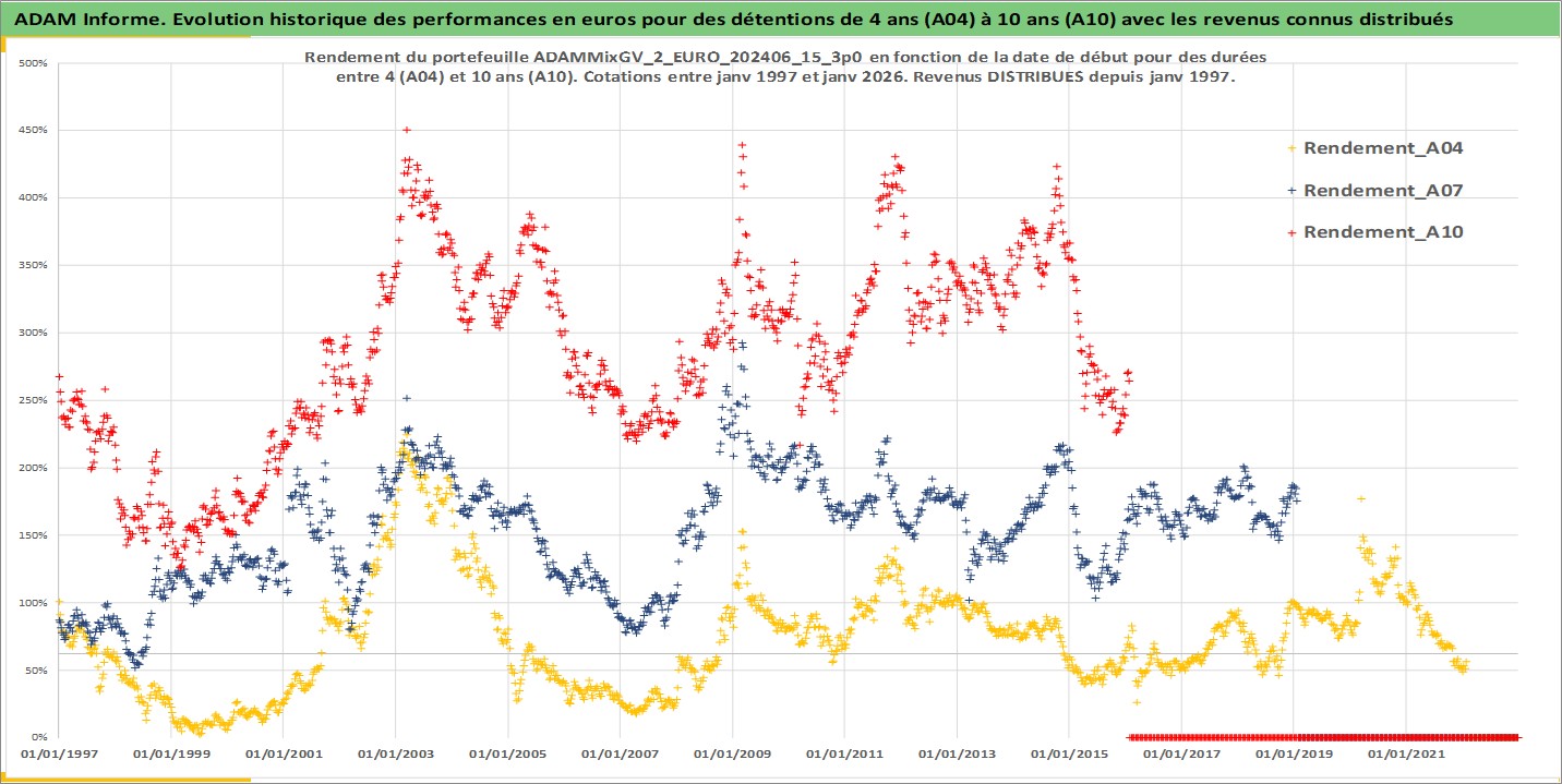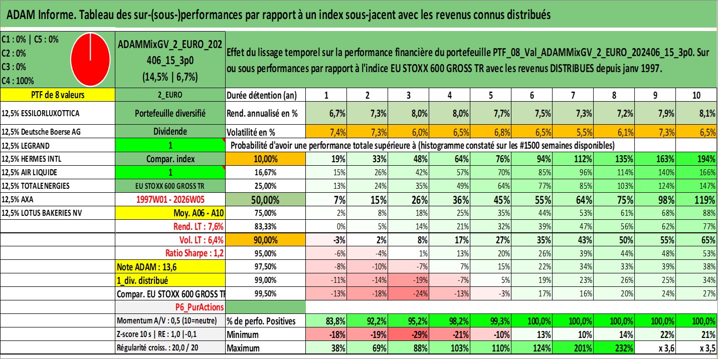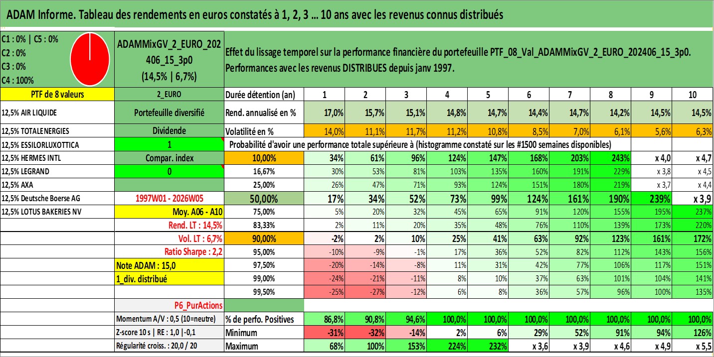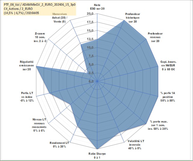Site dédié aux investisseursPage dédiée sur site financeAnalyse des valorisations hebdomadaires du portefeuille ADAMMixGV_2_EURO_202406_15_3p0_8actifs avec un profil P6_PurActions. Ce portefeuille est cote en EUR. Les valorisations couvrent les semaines 1997W01 a 2026W05. Les revenus de cet actif financier sont pris en compte depuis la semaine 1997W01. La note globale ESG de cet actif est estimee a 12.3 (apres rebasage entre 0 et 20).
