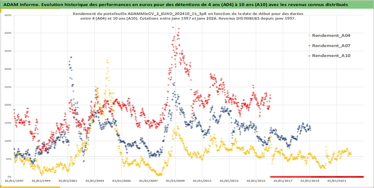 Site dédié aux investisseursPage dédiée sur site financeAnalyse des valorisations hebdomadaires du portefeuille ADAMMixGV_2_EURO_202410_15_3p8_6actifs avec un profil P6_PurActions. Ce portefeuille est cote en EUR. Les valorisations couvrent les semaines 1997W01 a 2026W05. Les revenus de cet actif financier sont pris en compte depuis la semaine 1997W01. La note globale ESG de cet actif est estimee a 12.5 (apres rebasage entre 0 et 20).