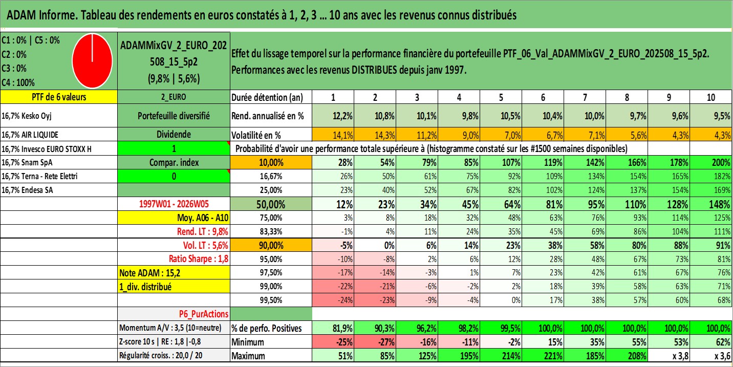 Site dédié aux investisseursPage dédiée sur site financeAnalyse des valorisations hebdomadaires du portefeuille ADAMMixGV_2_EURO_202508_15_5p2_6actifs avec un profil P6_PurActions. Ce portefeuille est cote en EUR. Les valorisations couvrent les semaines 1997W01 a 2026W05. Les revenus de cet actif financier sont pris en compte depuis la semaine 1997W01. La note globale ESG de cet actif est estimee a 14.3 (apres rebasage entre 0 et 20).
