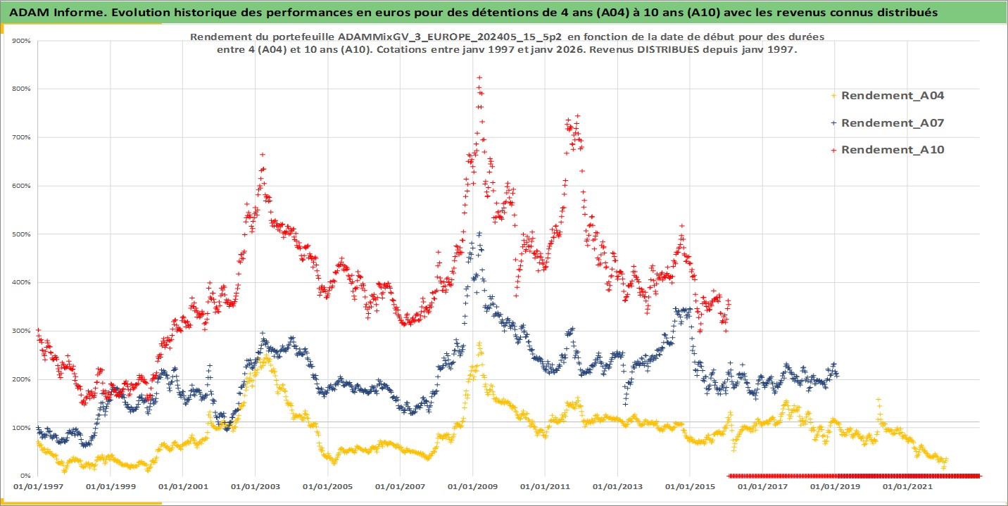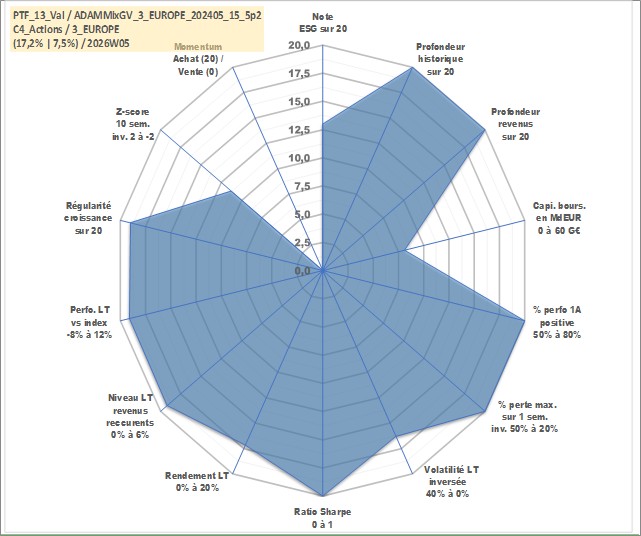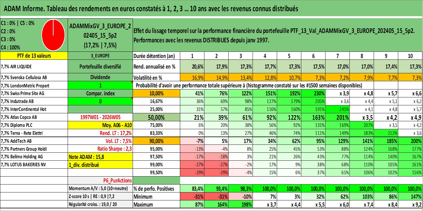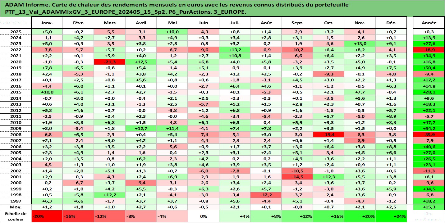 Site dédié aux investisseursPage dédiée sur site financeAnalyse des valorisations hebdomadaires du portefeuille ADAMMixGV_3_EUROPE_202405_15_5p2_13actifs avec un profil P6_PurActions. Ce portefeuille est cote en EUR. Les valorisations couvrent les semaines 1997W01 a 2026W05. Les revenus de cet actif financier sont pris en compte depuis la semaine 1997W01. La note globale ESG de cet actif est estimee a 13.0 (apres rebasage entre 0 et 20).