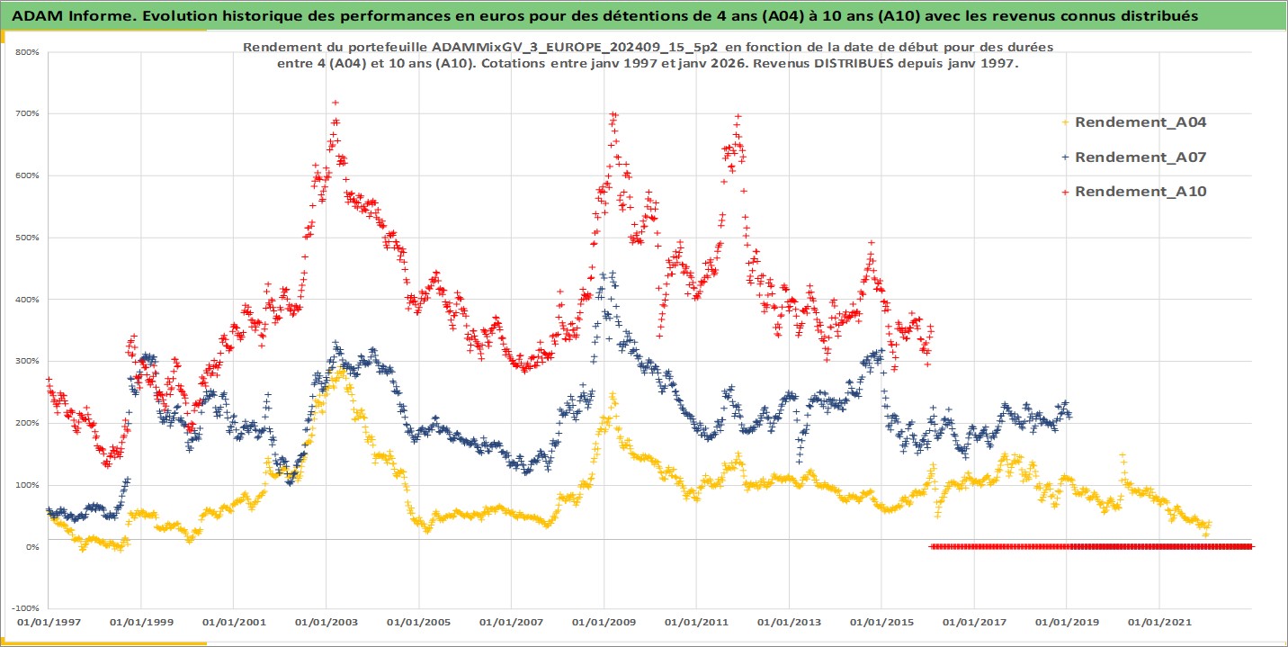 Site dédié aux investisseursPage dédiée sur site financeAnalyse des valorisations hebdomadaires du portefeuille ADAMMixGV_3_EUROPE_202409_15_5p2_13actifs avec un profil P6_PurActions. Ce portefeuille est cote en EUR. Les valorisations couvrent les semaines 1997W01 a 2026W05. Les revenus de cet actif financier sont pris en compte depuis la semaine 1997W01. La note globale ESG de cet actif est estimee a 13.8 (apres rebasage entre 0 et 20).