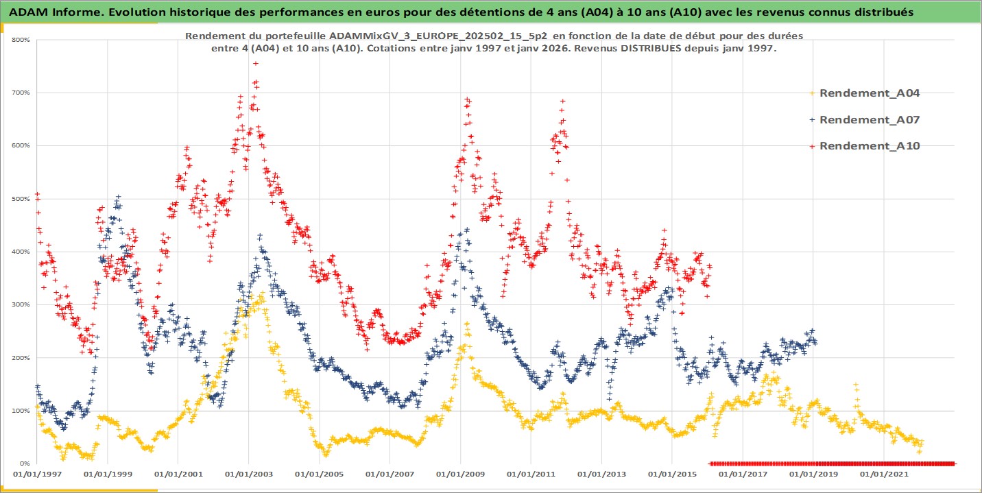 Site dédié aux investisseursPage dédiée sur site financeAnalyse des valorisations hebdomadaires du portefeuille ADAMMixGV_3_EUROPE_202502_15_5p2_12actifs avec un profil P6_PurActions. Ce portefeuille est cote en EUR. Les valorisations couvrent les semaines 1997W01 a 2026W05. Les revenus de cet actif financier sont pris en compte depuis la semaine 1997W01. La note globale ESG de cet actif est estimee a 13.8 (apres rebasage entre 0 et 20).