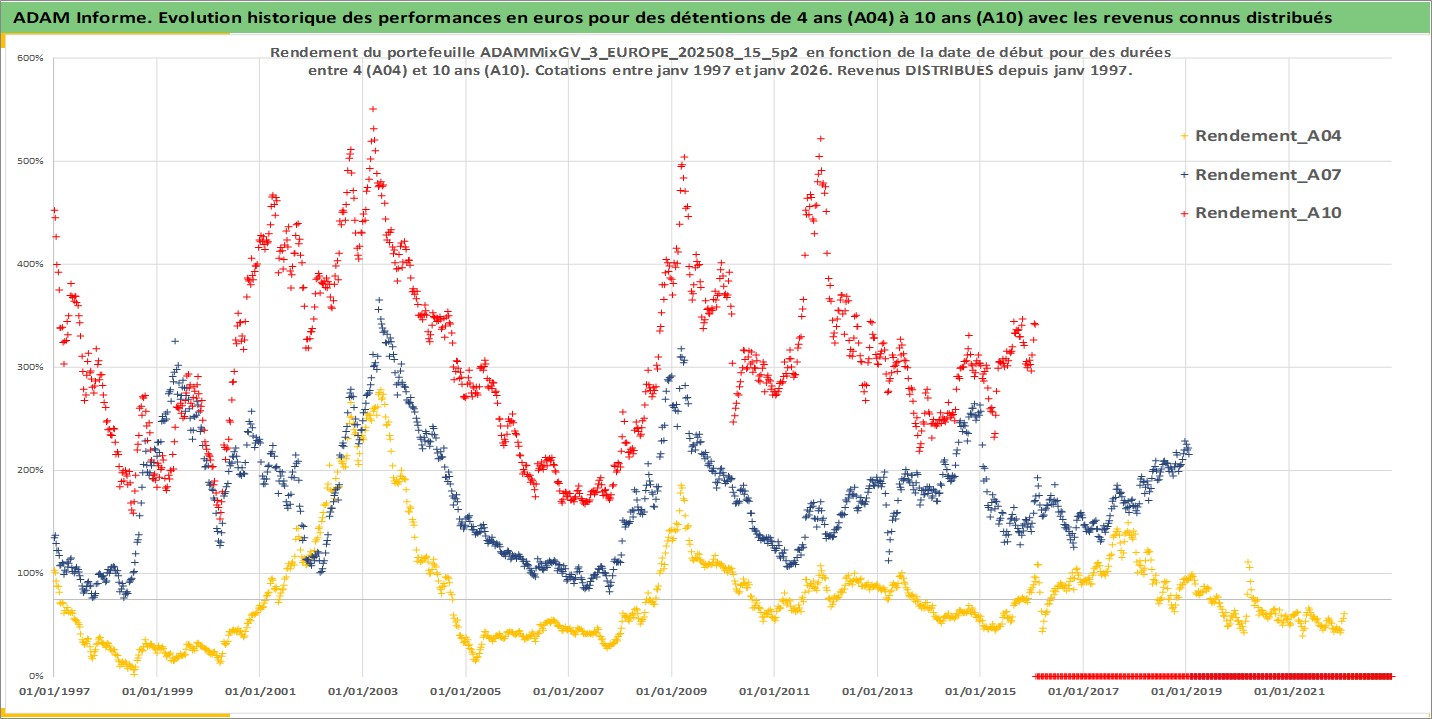 Site dédié aux investisseursPage dédiée sur site financeAnalyse des valorisations hebdomadaires du portefeuille ADAMMixGV_3_EUROPE_202508_15_5p2_12actifs avec un profil P6_PurActions. Ce portefeuille est cote en EUR. Les valorisations couvrent les semaines 1997W01 a 2026W05. Les revenus de cet actif financier sont pris en compte depuis la semaine 1997W01. La note globale ESG de cet actif est estimee a 14.4 (apres rebasage entre 0 et 20).