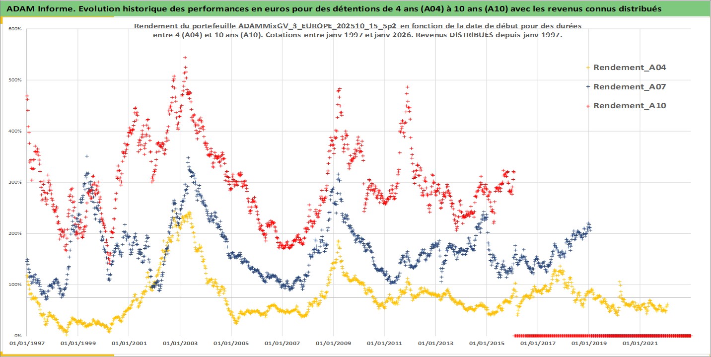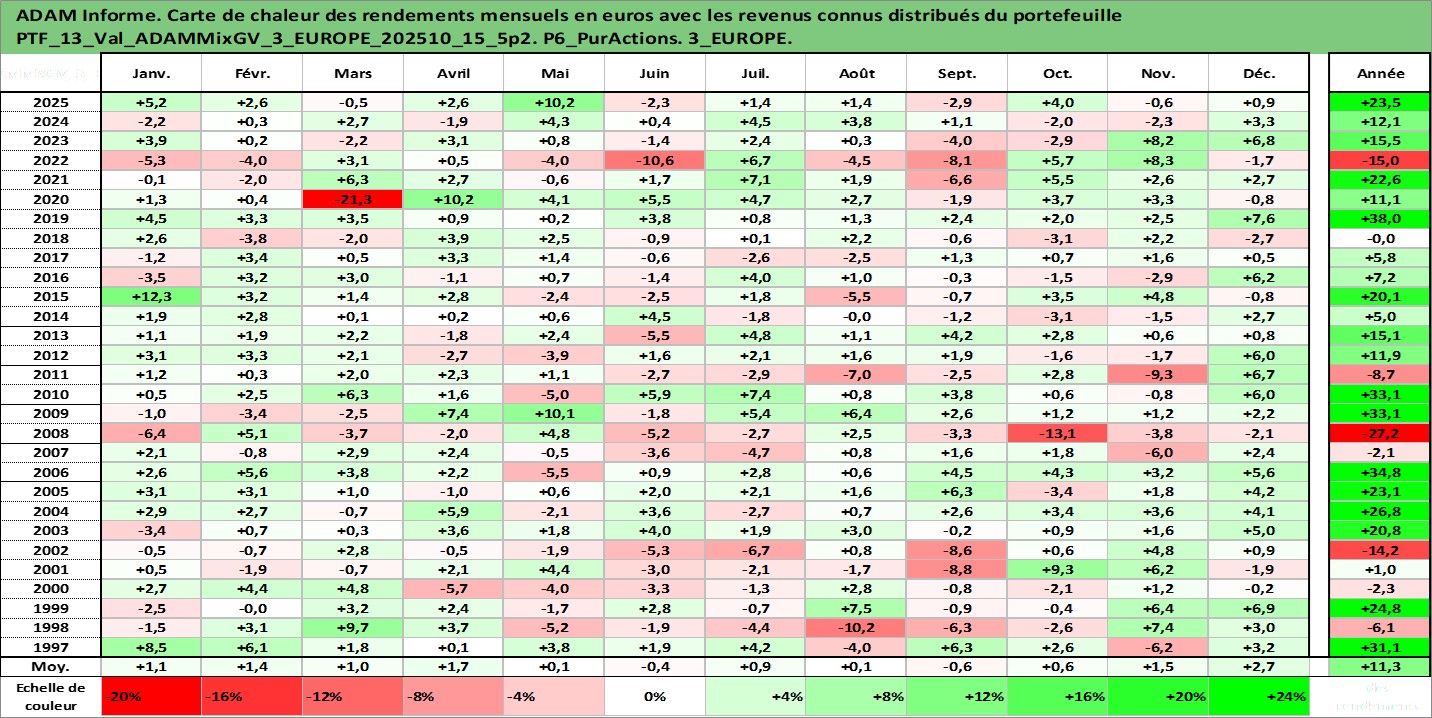 Site dédié aux investisseursPage dédiée sur site financeAnalyse des valorisations hebdomadaires du portefeuille ADAMMixGV_3_EUROPE_202510_15_5p2_13actifs avec un profil P6_PurActions. Ce portefeuille est cote en EUR. Les valorisations couvrent les semaines 1997W01 a 2026W05. Les revenus de cet actif financier sont pris en compte depuis la semaine 1997W01. La note globale ESG de cet actif est estimee a 13.5 (apres rebasage entre 0 et 20).