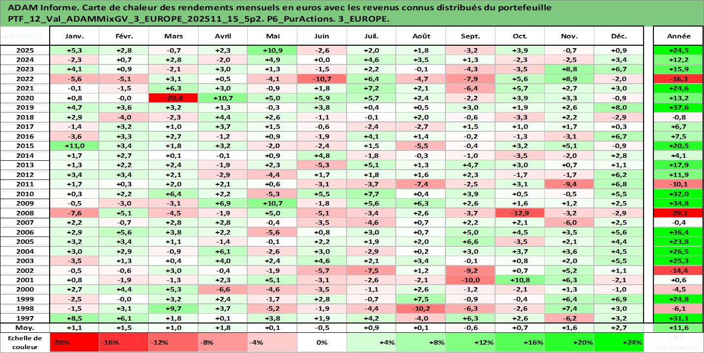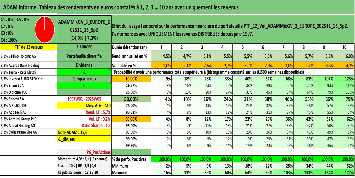 Site dédié aux investisseursPage dédiée sur site financeAnalyse des valorisations hebdomadaires du portefeuille ADAMMixGV_3_EUROPE_202511_15_5p2_12actifs avec un profil P6_PurActions. Ce portefeuille est cote en EUR. Les valorisations couvrent les semaines 1997W01 a 2026W05. Les revenus de cet actif financier sont pris en compte depuis la semaine 1997W01. La note globale ESG de cet actif est estimee a 13.5 (apres rebasage entre 0 et 20).