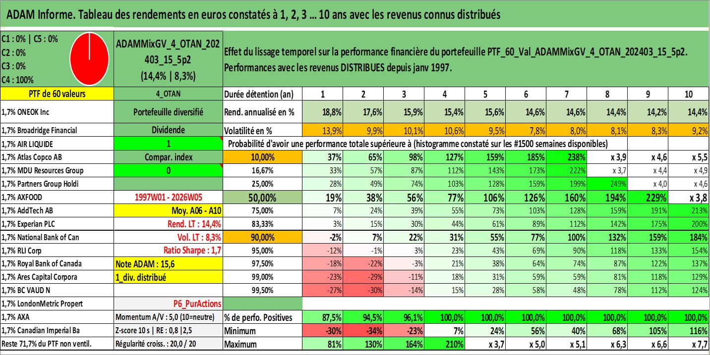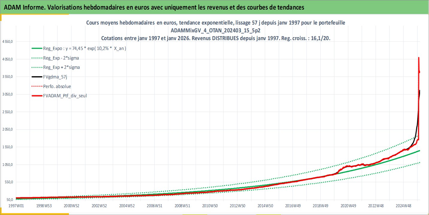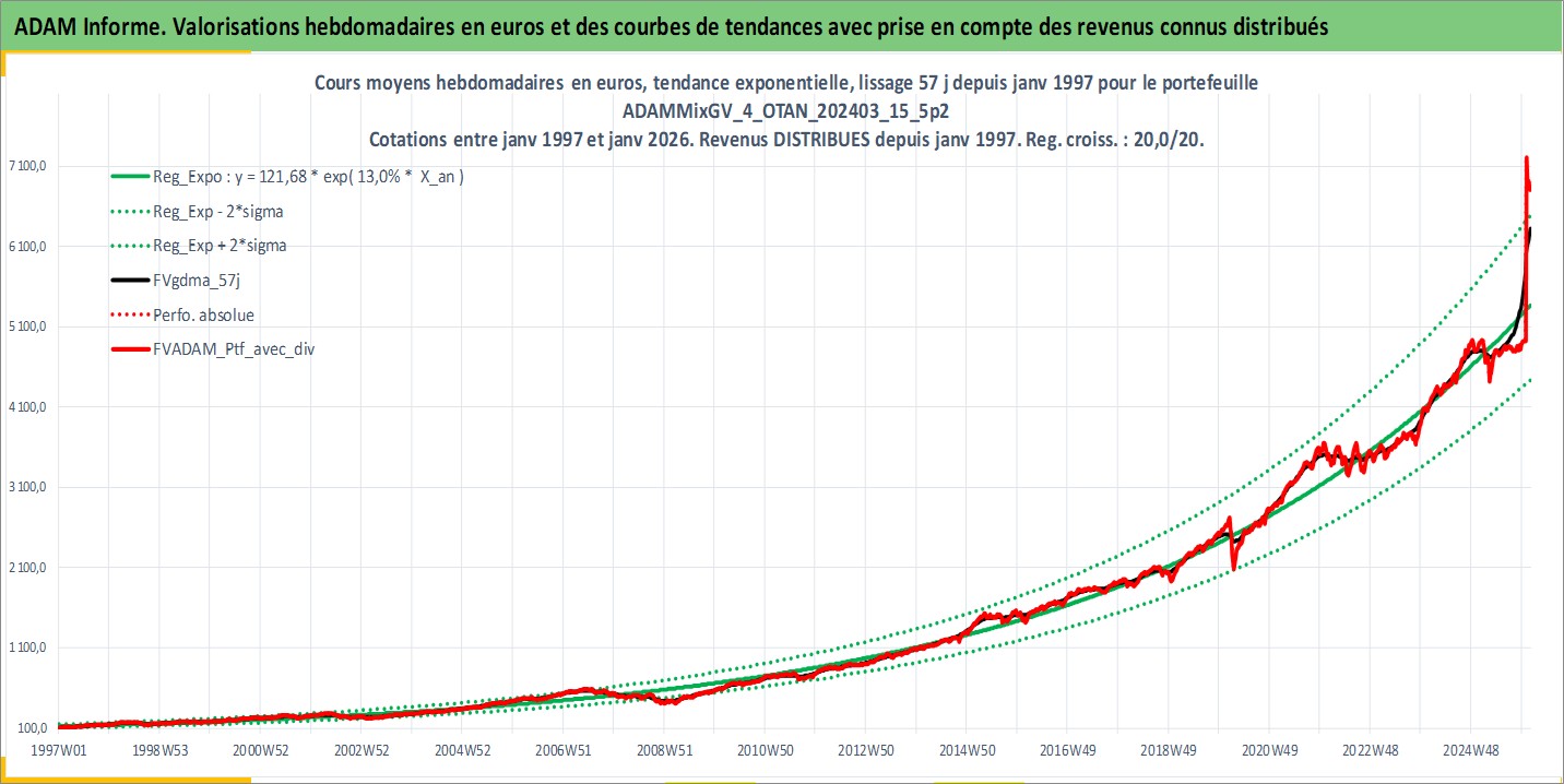 Site dédié aux investisseursPage dédiée sur site financeAnalyse des valorisations hebdomadaires du portefeuille ADAMMixGV_4_OTAN_202403_15_5p2_60actifs avec un profil P6_PurActions. Ce portefeuille est cote en EUR. Les valorisations couvrent les semaines 1997W01 a 2026W05. Les revenus de cet actif financier sont pris en compte depuis la semaine 1997W01. La note globale ESG de cet actif est estimee a 10.2 (apres rebasage entre 0 et 20).