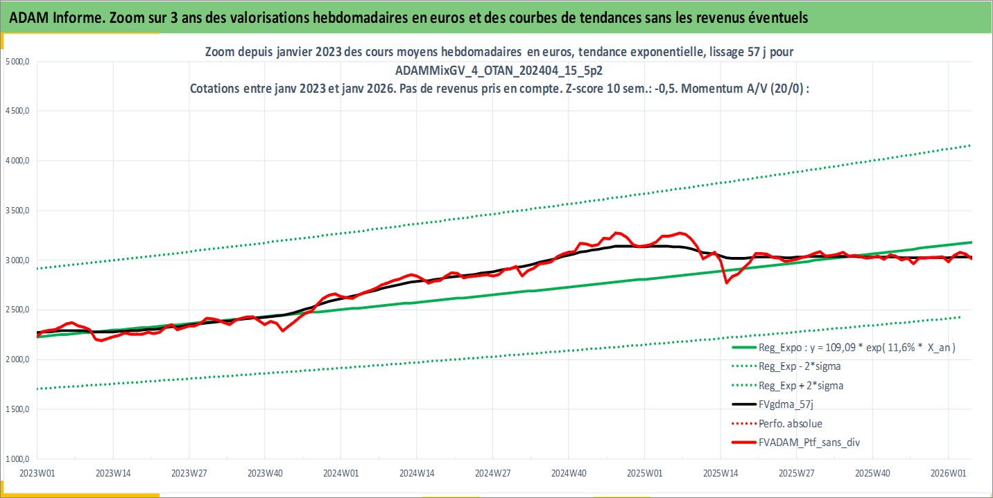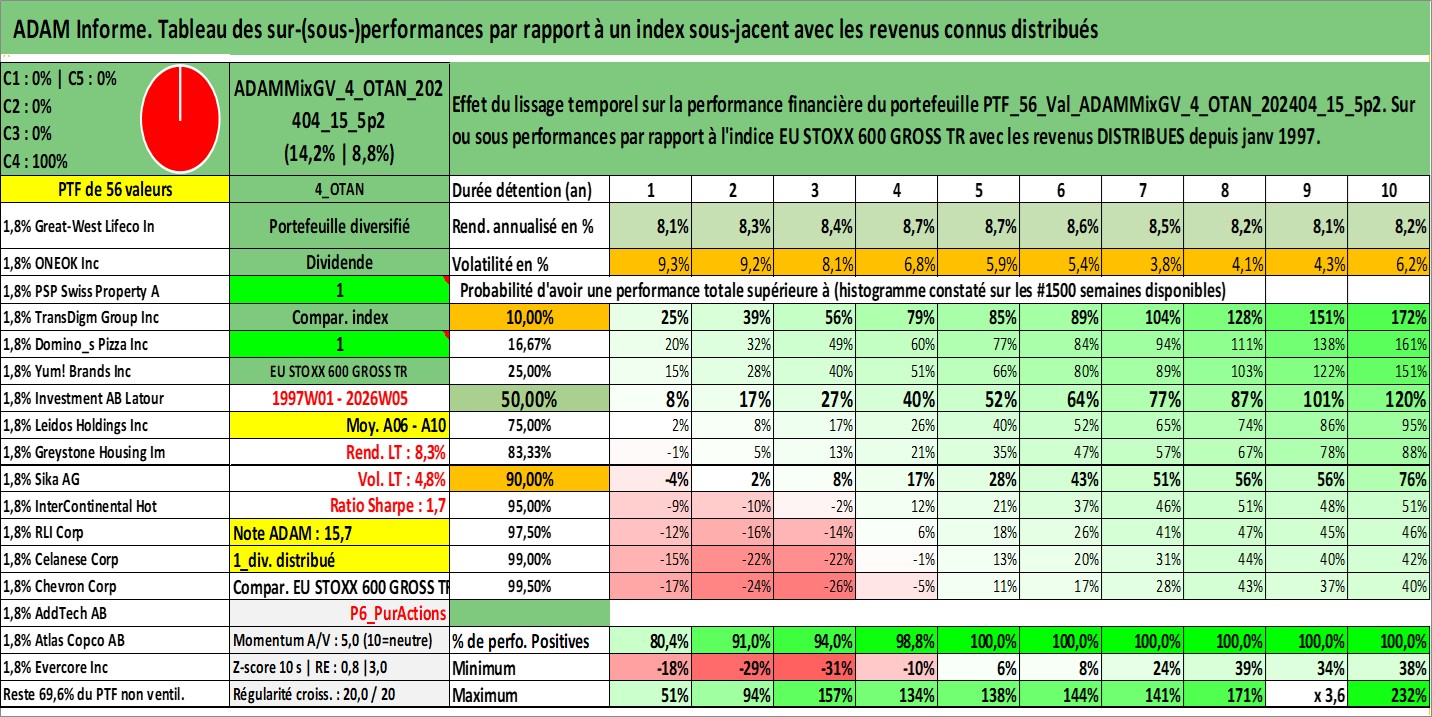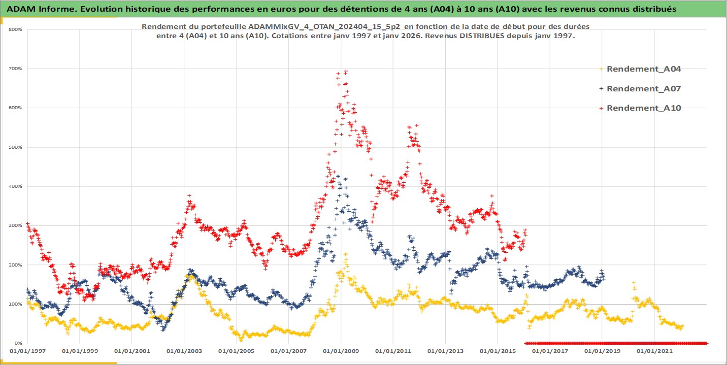 Site dédié aux investisseursPage dédiée sur site financeAnalyse des valorisations hebdomadaires du portefeuille ADAMMixGV_4_OTAN_202404_15_5p2_56actifs avec un profil P6_PurActions. Ce portefeuille est cote en EUR. Les valorisations couvrent les semaines 1997W01 a 2026W05. Les revenus de cet actif financier sont pris en compte depuis la semaine 1997W01. La note globale ESG de cet actif est estimee a 10.2 (apres rebasage entre 0 et 20).