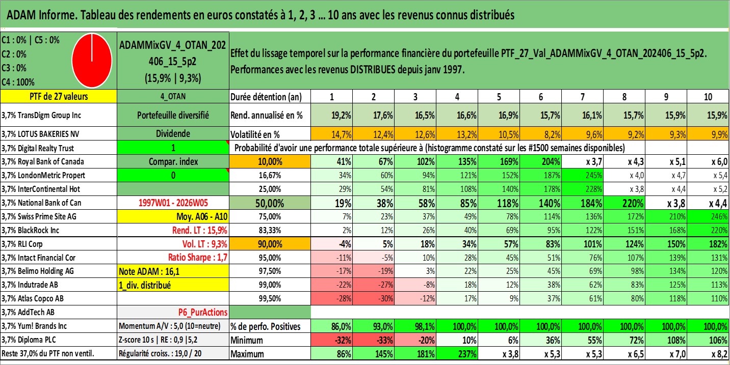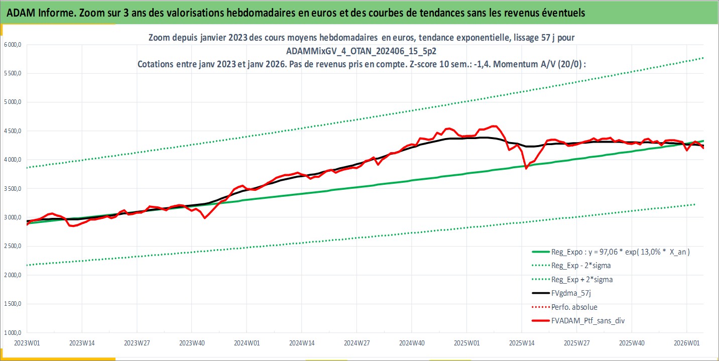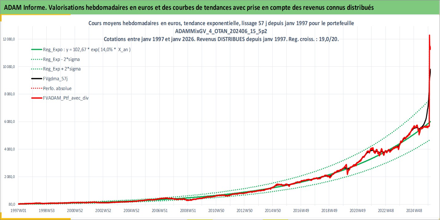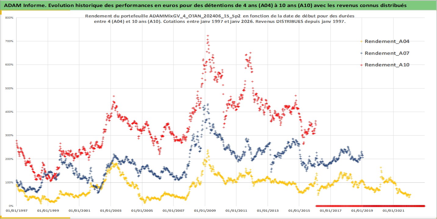 Site dédié aux investisseursPage dédiée sur site financeAnalyse des valorisations hebdomadaires du portefeuille ADAMMixGV_4_OTAN_202406_15_5p2_27actifs avec un profil P6_PurActions. Ce portefeuille est cote en EUR. Les valorisations couvrent les semaines 1997W01 a 2026W05. Les revenus de cet actif financier sont pris en compte depuis la semaine 1997W01. La note globale ESG de cet actif est estimee a 11.3 (apres rebasage entre 0 et 20).