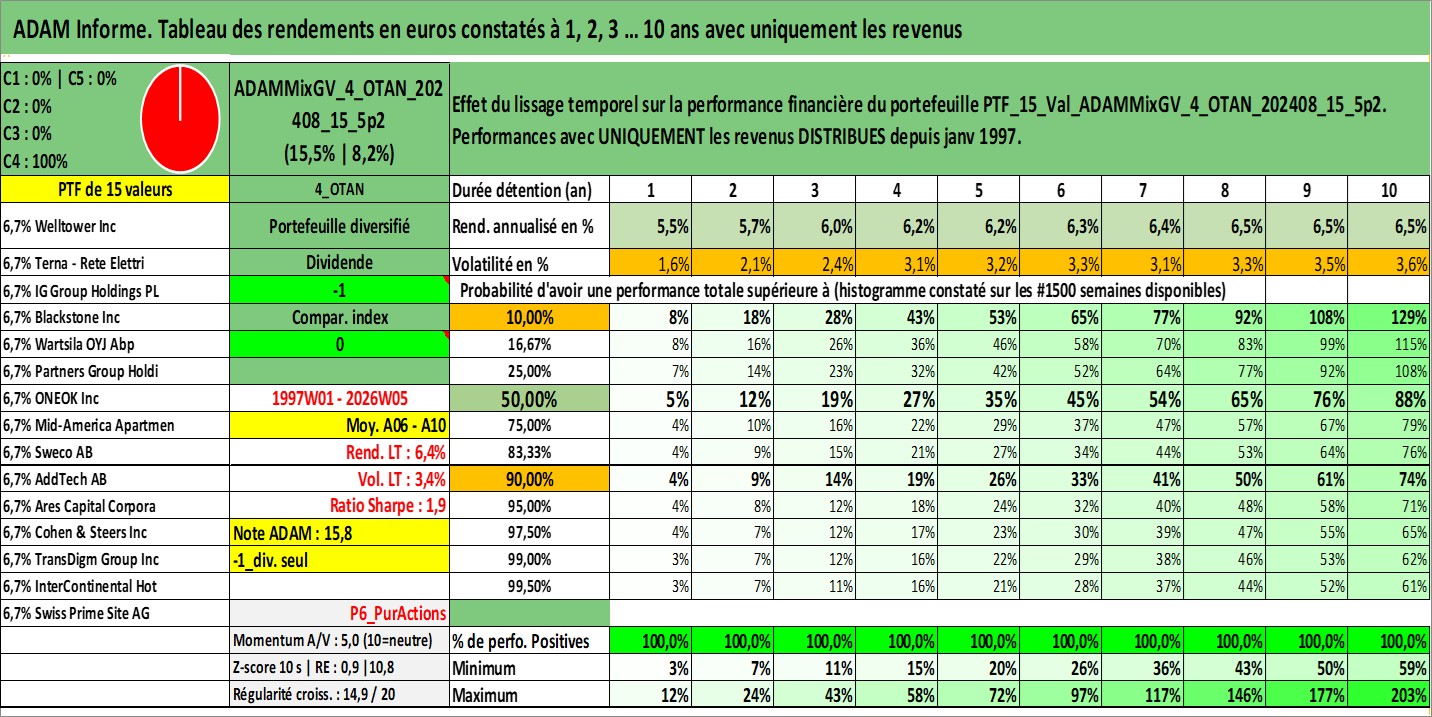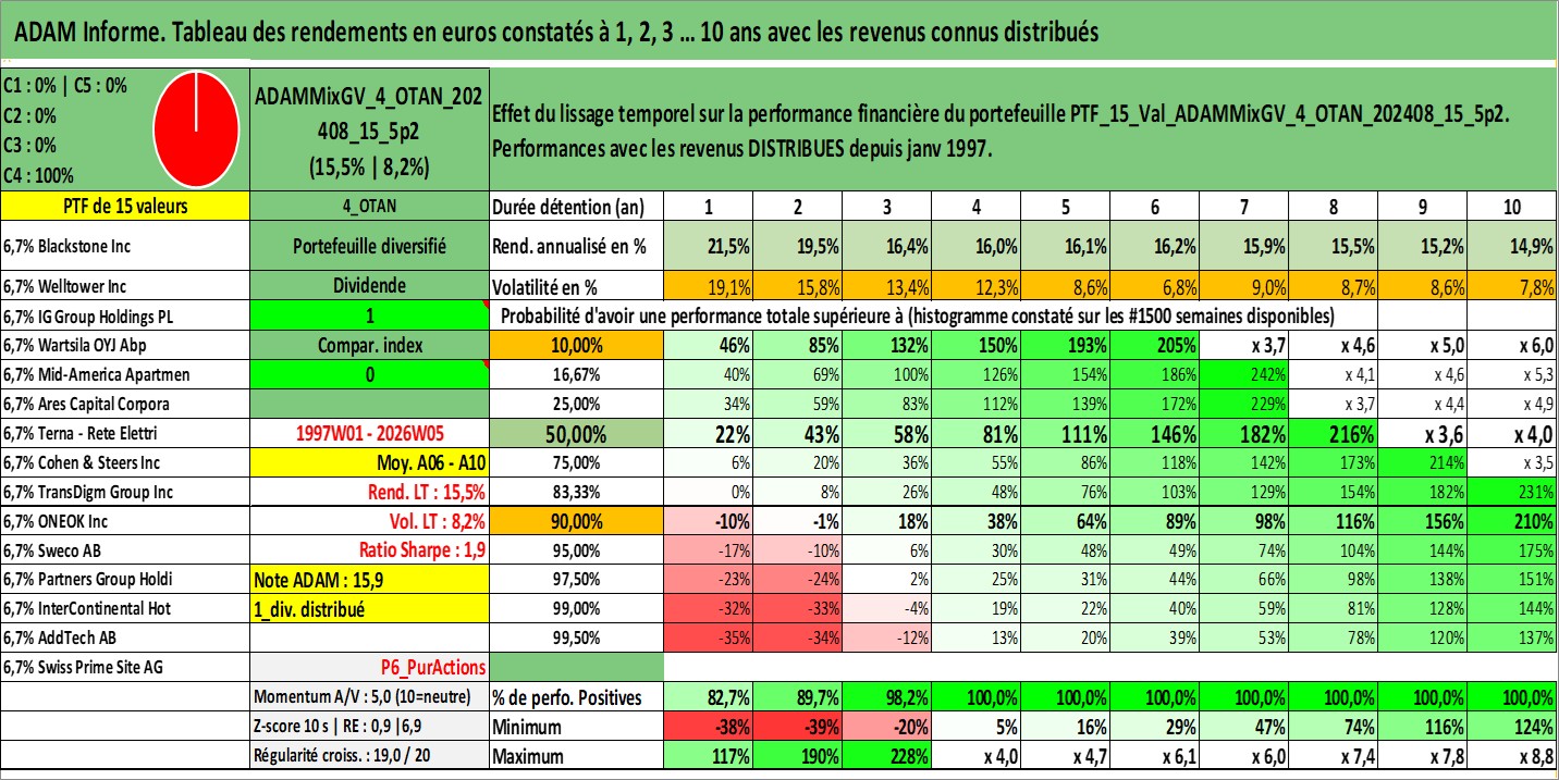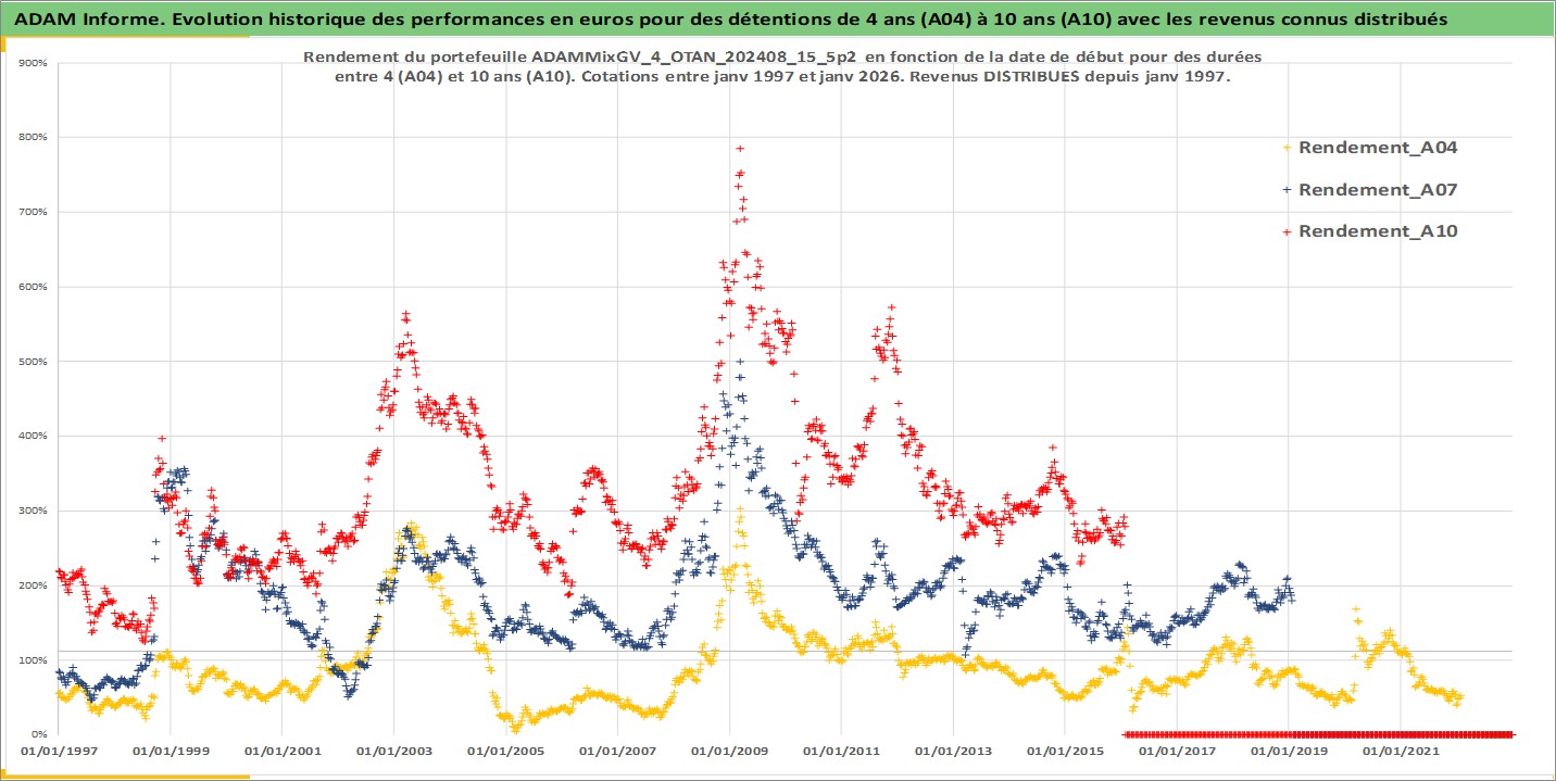 Site dédié aux investisseursPage dédiée sur site financeAnalyse des valorisations hebdomadaires du portefeuille ADAMMixGV_4_OTAN_202408_15_5p2_15actifs avec un profil P6_PurActions. Ce portefeuille est cote en EUR. Les valorisations couvrent les semaines 1997W01 a 2026W05. Les revenus de cet actif financier sont pris en compte depuis la semaine 1997W01. La note globale ESG de cet actif est estimee a 11.0 (apres rebasage entre 0 et 20).