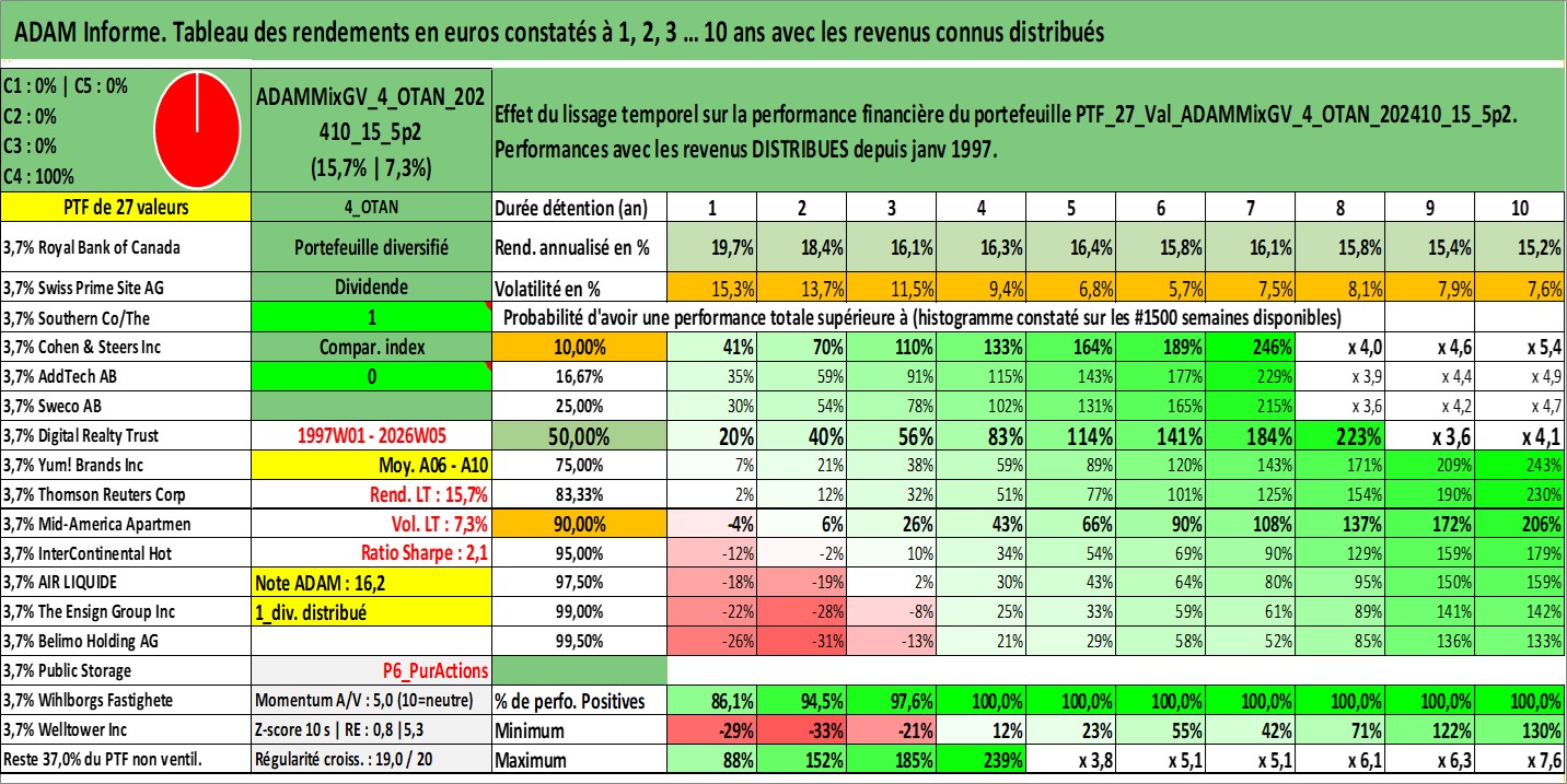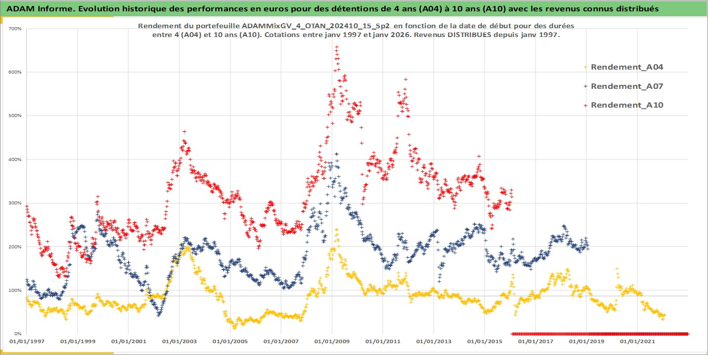 Site dédié aux investisseursPage dédiée sur site financeAnalyse des valorisations hebdomadaires du portefeuille ADAMMixGV_4_OTAN_202410_15_5p2_27actifs avec un profil P6_PurActions. Ce portefeuille est cote en EUR. Les valorisations couvrent les semaines 1997W01 a 2026W05. Les revenus de cet actif financier sont pris en compte depuis la semaine 1997W01. La note globale ESG de cet actif est estimee a 11.8 (apres rebasage entre 0 et 20).