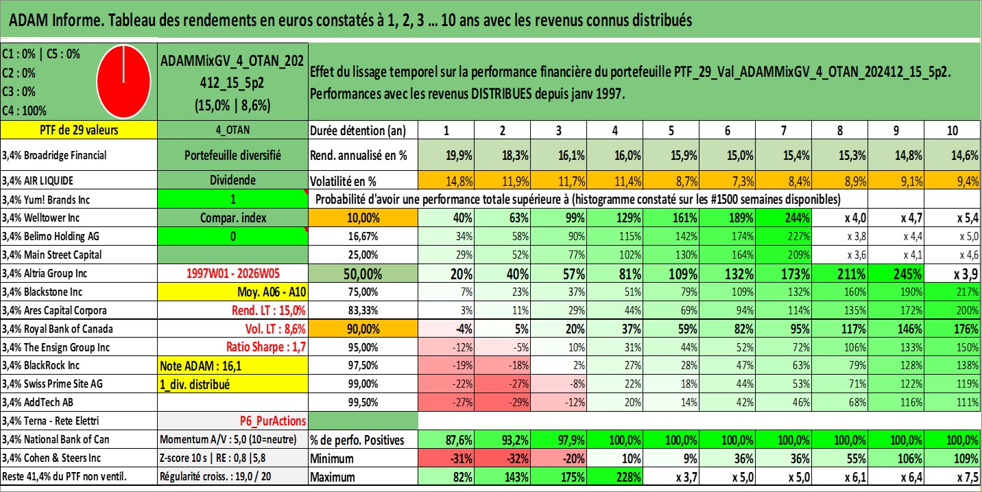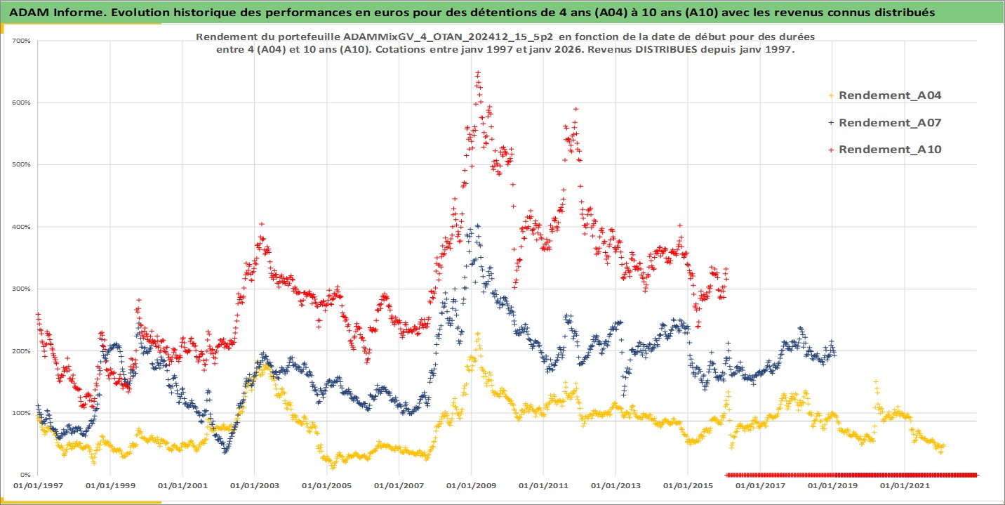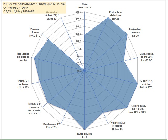 Site dédié aux investisseursPage dédiée sur site financeAnalyse des valorisations hebdomadaires du portefeuille ADAMMixGV_4_OTAN_202412_15_5p2_29actifs avec un profil P6_PurActions. Ce portefeuille est cote en EUR. Les valorisations couvrent les semaines 1997W01 a 2026W05. Les revenus de cet actif financier sont pris en compte depuis la semaine 1997W01. La note globale ESG de cet actif est estimee a 12.1 (apres rebasage entre 0 et 20).