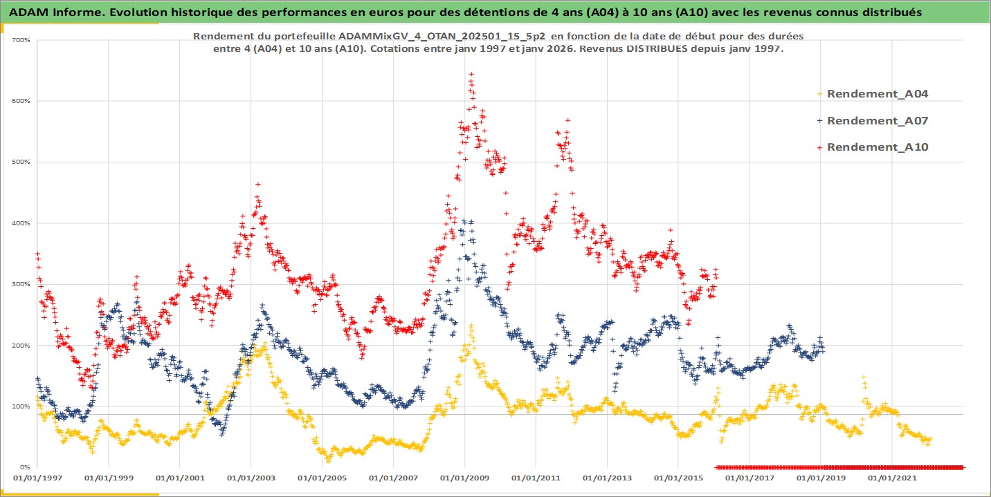 Site dédié aux investisseursPage dédiée sur site financeAnalyse des valorisations hebdomadaires du portefeuille ADAMMixGV_4_OTAN_202501_15_5p2_33actifs avec un profil P6_PurActions. Ce portefeuille est cote en EUR. Les valorisations couvrent les semaines 1997W01 a 2026W05. Les revenus de cet actif financier sont pris en compte depuis la semaine 1997W01. La note globale ESG de cet actif est estimee a 11.4 (apres rebasage entre 0 et 20).