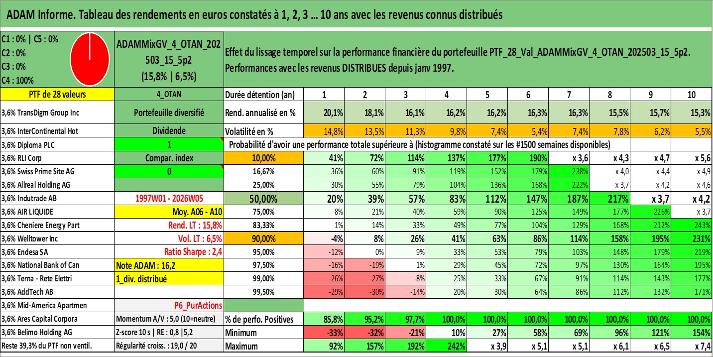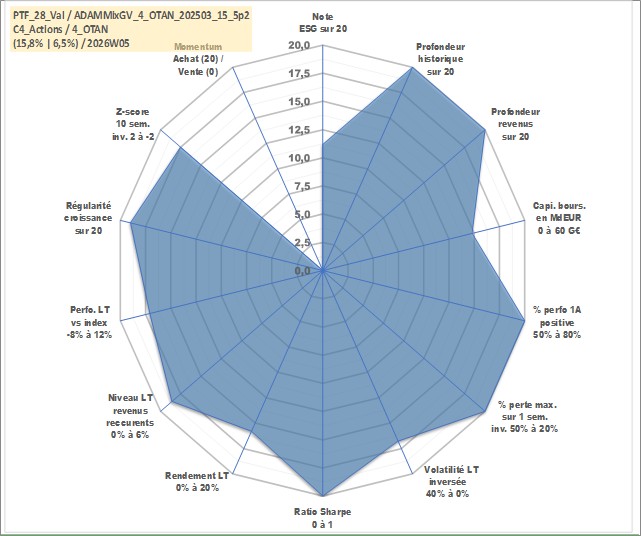 Site dédié aux investisseursPage dédiée sur site financeAnalyse des valorisations hebdomadaires du portefeuille ADAMMixGV_4_OTAN_202503_15_5p2_28actifs avec un profil P6_PurActions. Ce portefeuille est cote en EUR. Les valorisations couvrent les semaines 1997W01 a 2026W05. Les revenus de cet actif financier sont pris en compte depuis la semaine 1997W01. La note globale ESG de cet actif est estimee a 11.2 (apres rebasage entre 0 et 20).