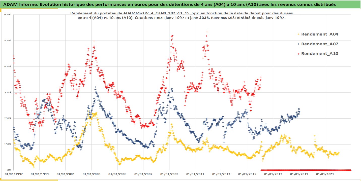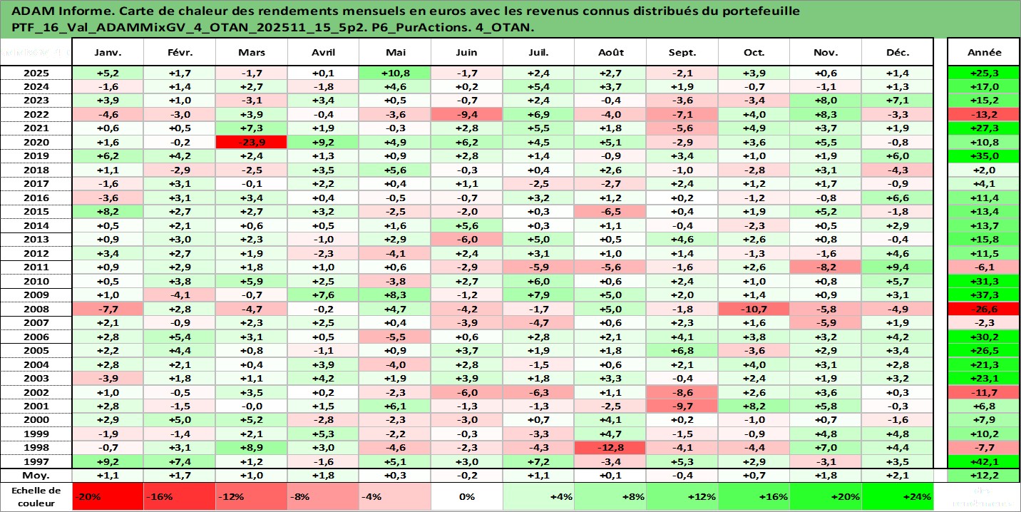 Site dédié aux investisseursPage dédiée sur site financeAnalyse des valorisations hebdomadaires du portefeuille ADAMMixGV_4_OTAN_202511_15_5p2_16actifs avec un profil P6_PurActions. Ce portefeuille est cote en EUR. Les valorisations couvrent les semaines 1997W01 a 2026W05. Les revenus de cet actif financier sont pris en compte depuis la semaine 1997W01. La note globale ESG de cet actif est estimee a 13.3 (apres rebasage entre 0 et 20).
