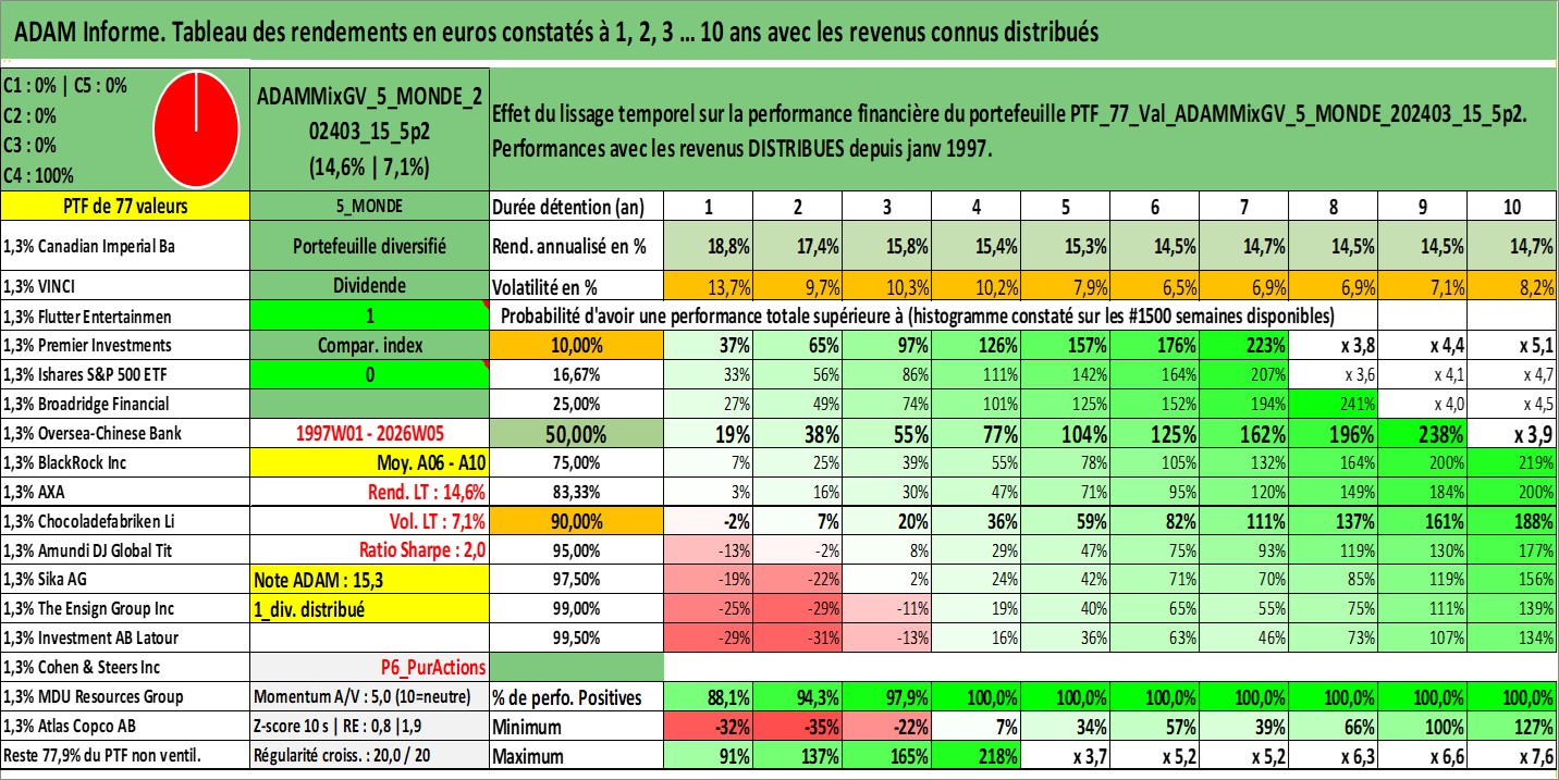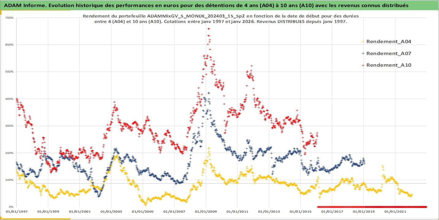 Site dédié aux investisseursPage dédiée sur site financeAnalyse des valorisations hebdomadaires du portefeuille ADAMMixGV_5_MONDE_202403_15_5p2_77actifs avec un profil P6_PurActions. Ce portefeuille est cote en EUR. Les valorisations couvrent les semaines 1997W01 a 2026W05. Les revenus de cet actif financier sont pris en compte depuis la semaine 1997W01. La note globale ESG de cet actif est estimee a 10.0 (apres rebasage entre 0 et 20).