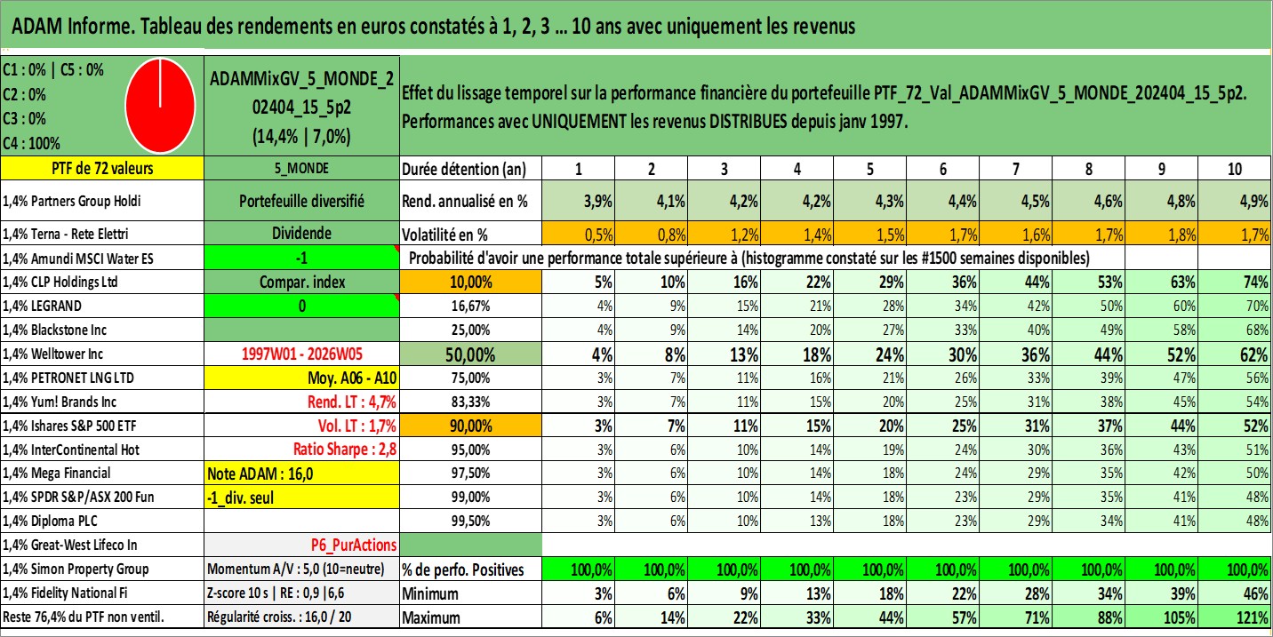 Site dédié aux investisseursPage dédiée sur site financeAnalyse des valorisations hebdomadaires du portefeuille ADAMMixGV_5_MONDE_202404_15_5p2_72actifs avec un profil P6_PurActions. Ce portefeuille est cote en EUR. Les valorisations couvrent les semaines 1997W01 a 2026W05. Les revenus de cet actif financier sont pris en compte depuis la semaine 1997W01. La note globale ESG de cet actif est estimee a 9.9 (apres rebasage entre 0 et 20).
