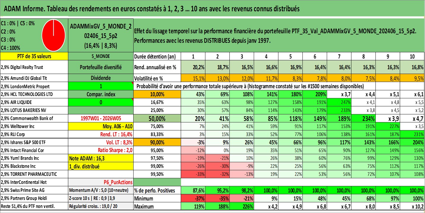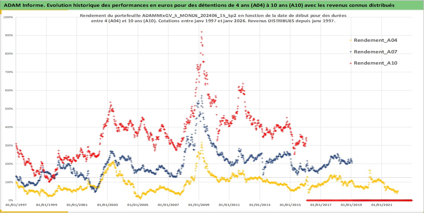Site dédié aux investisseursPage dédiée sur site financeAnalyse des valorisations hebdomadaires du portefeuille ADAMMixGV_5_MONDE_202406_15_5p2_35actifs avec un profil P6_PurActions. Ce portefeuille est cote en EUR. Les valorisations couvrent les semaines 1997W01 a 2026W05. Les revenus de cet actif financier sont pris en compte depuis la semaine 1997W01. La note globale ESG de cet actif est estimee a 11.6 (apres rebasage entre 0 et 20).