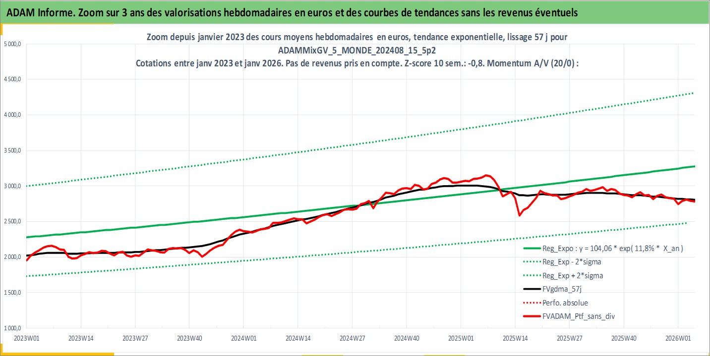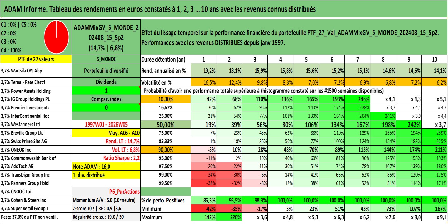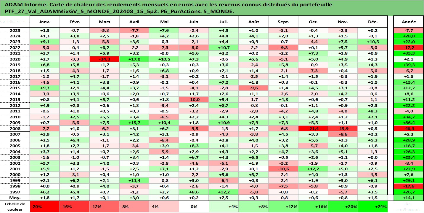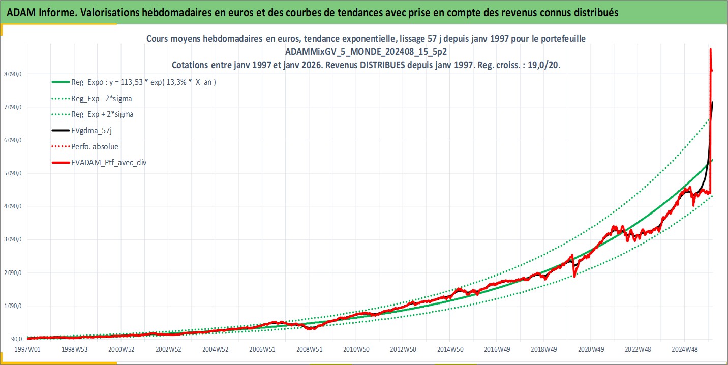 Site dédié aux investisseursPage dédiée sur site financeAnalyse des valorisations hebdomadaires du portefeuille ADAMMixGV_5_MONDE_202408_15_5p2_27actifs avec un profil P6_PurActions. Ce portefeuille est cote en EUR. Les valorisations couvrent les semaines 1997W01 a 2026W05. Les revenus de cet actif financier sont pris en compte depuis la semaine 1997W01. La note globale ESG de cet actif est estimee a 9.3 (apres rebasage entre 0 et 20).