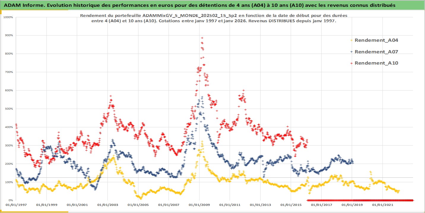 Site dédié aux investisseursPage dédiée sur site financeAnalyse des valorisations hebdomadaires du portefeuille ADAMMixGV_5_MONDE_202502_15_5p2_36actifs avec un profil P6_PurActions. Ce portefeuille est cote en EUR. Les valorisations couvrent les semaines 1997W01 a 2026W05. Les revenus de cet actif financier sont pris en compte depuis la semaine 1997W01. La note globale ESG de cet actif est estimee a 11.6 (apres rebasage entre 0 et 20).