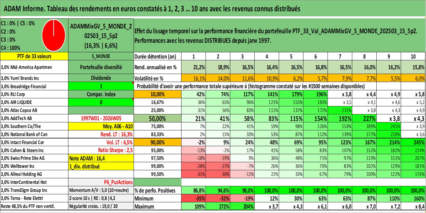Site dédié aux investisseursPage dédiée sur site financeAnalyse des valorisations hebdomadaires du portefeuille ADAMMixGV_5_MONDE_202503_15_5p2_33actifs avec un profil P6_PurActions. Ce portefeuille est cote en EUR. Les valorisations couvrent les semaines 1997W01 a 2026W05. Les revenus de cet actif financier sont pris en compte depuis la semaine 1997W01. La note globale ESG de cet actif est estimee a 11.3 (apres rebasage entre 0 et 20).