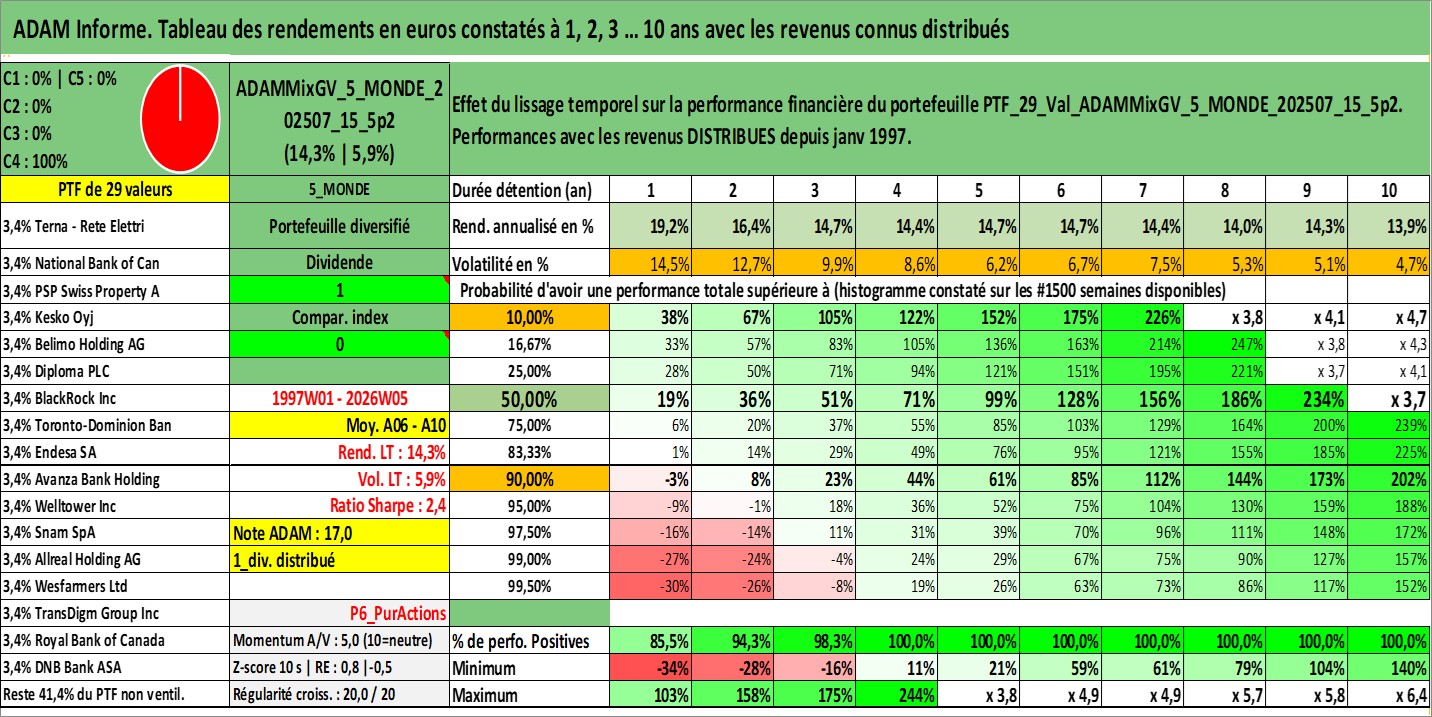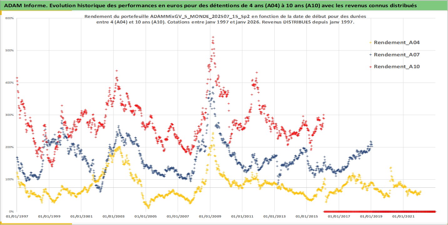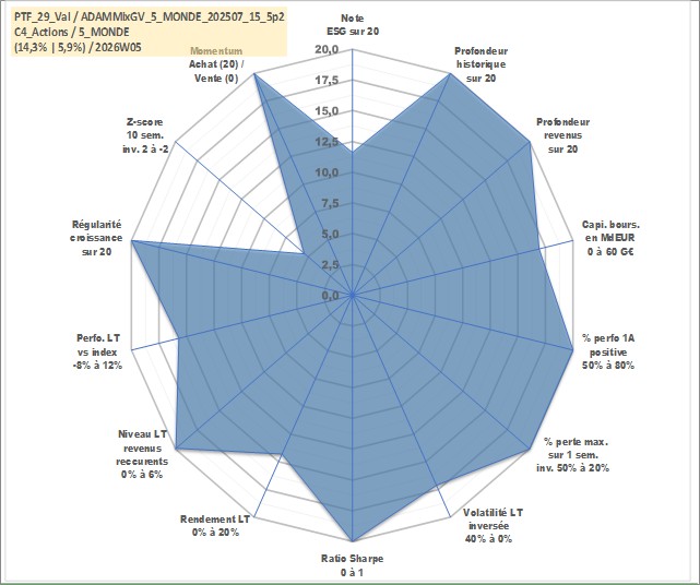 Site dédié aux investisseursPage dédiée sur site financeAnalyse des valorisations hebdomadaires du portefeuille ADAMMixGV_5_MONDE_202507_15_5p2_29actifs avec un profil P6_PurActions. Ce portefeuille est cote en EUR. Les valorisations couvrent les semaines 1997W01 a 2026W05. Les revenus de cet actif financier sont pris en compte depuis la semaine 1997W01. La note globale ESG de cet actif est estimee a 11.6 (apres rebasage entre 0 et 20).
