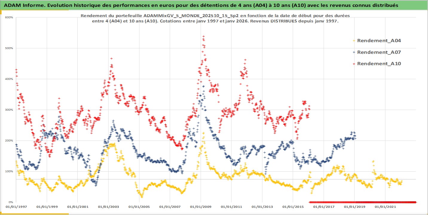 Site dédié aux investisseursPage dédiée sur site financeAnalyse des valorisations hebdomadaires du portefeuille ADAMMixGV_5_MONDE_202510_15_5p2_26actifs avec un profil P6_PurActions. Ce portefeuille est cote en EUR. Les valorisations couvrent les semaines 1997W01 a 2026W05. Les revenus de cet actif financier sont pris en compte depuis la semaine 1997W01. La note globale ESG de cet actif est estimee a 11.7 (apres rebasage entre 0 et 20).
