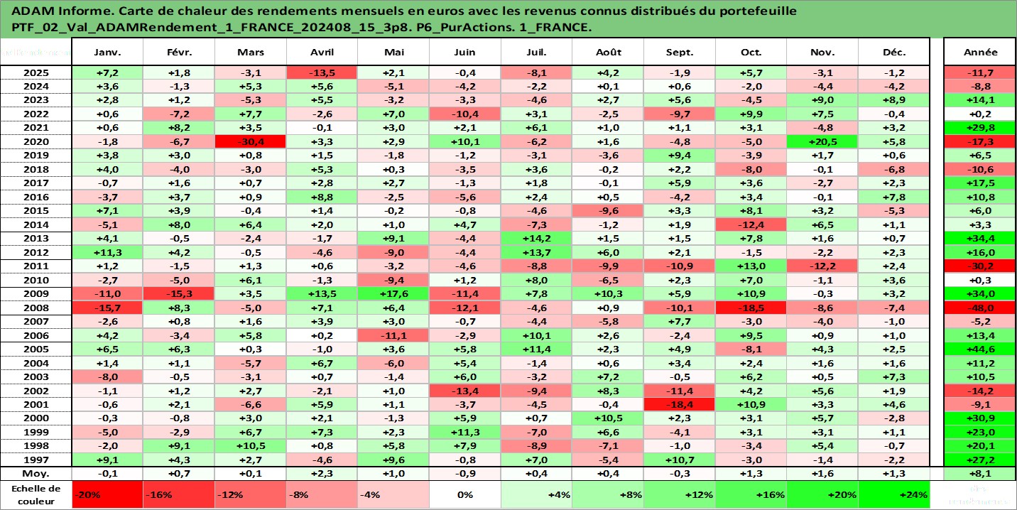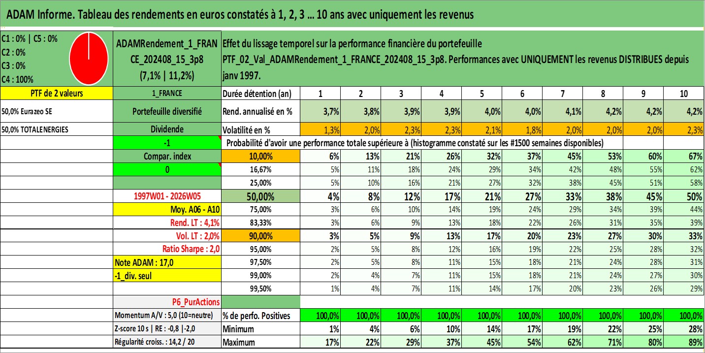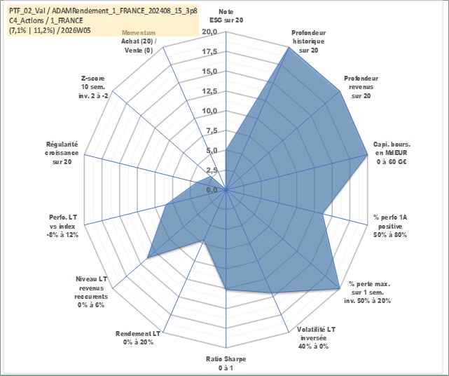 Site dédié aux investisseursPage dédiée sur site financeAnalyse des valorisations hebdomadaires du portefeuille ADAMRendement_1_FRANCE_202408_15_3p8_2actifs avec un profil P6_PurActions. Ce portefeuille est cote en EUR. Les valorisations couvrent les semaines 1997W01 a 2026W05. Les revenus de cet actif financier sont pris en compte depuis la semaine 1997W01. La note globale ESG de cet actif est estimee a 5.0 (apres rebasage entre 0 et 20).