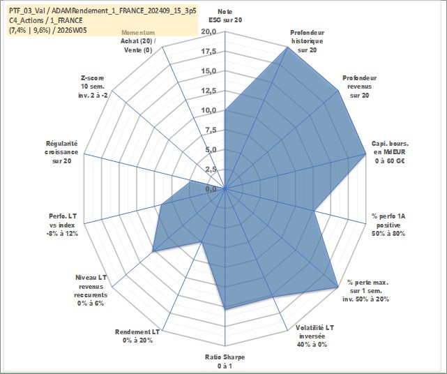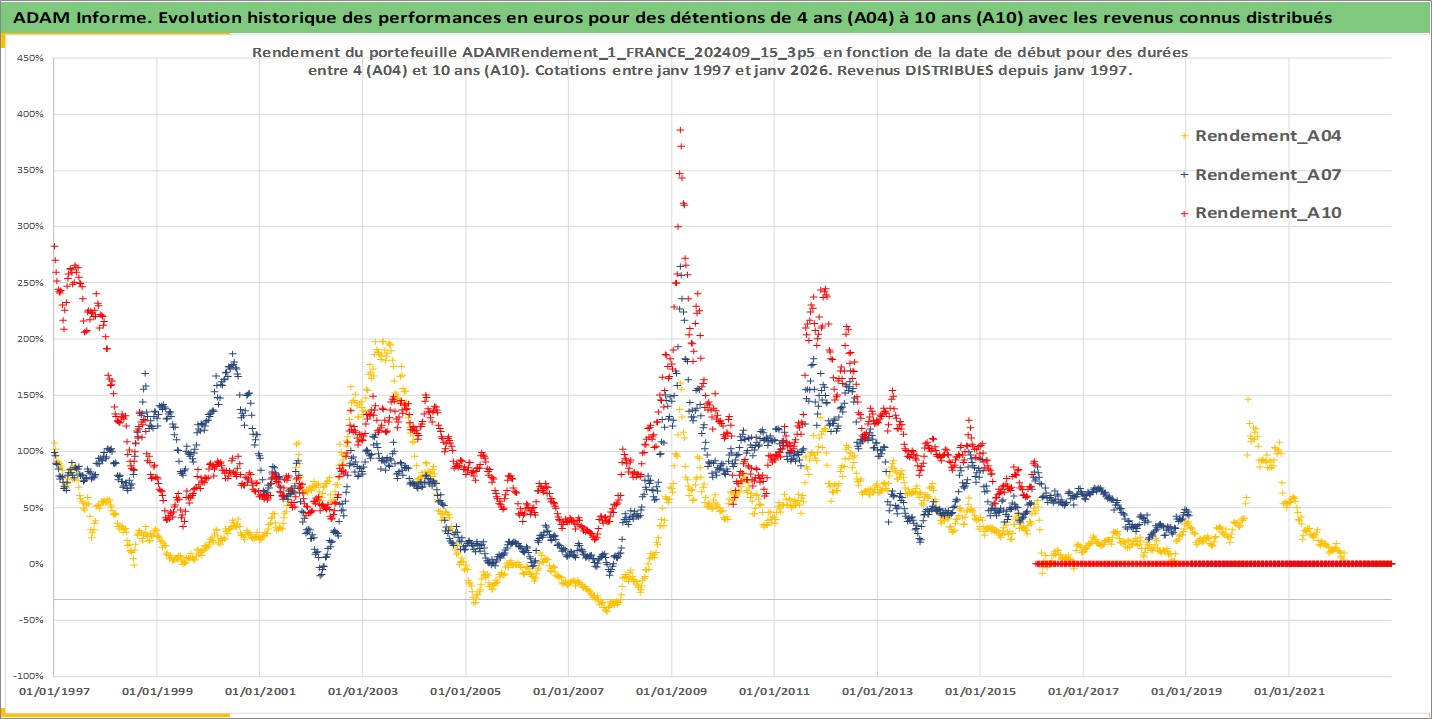 Site dédié aux investisseursPage dédiée sur site financeAnalyse des valorisations hebdomadaires du portefeuille ADAMRendement_1_FRANCE_202409_15_3p5_3actifs avec un profil P6_PurActions. Ce portefeuille est cote en EUR. Les valorisations couvrent les semaines 1997W01 a 2026W05. Les revenus de cet actif financier sont pris en compte depuis la semaine 1997W01. La note globale ESG de cet actif est estimee a 10.0 (apres rebasage entre 0 et 20).