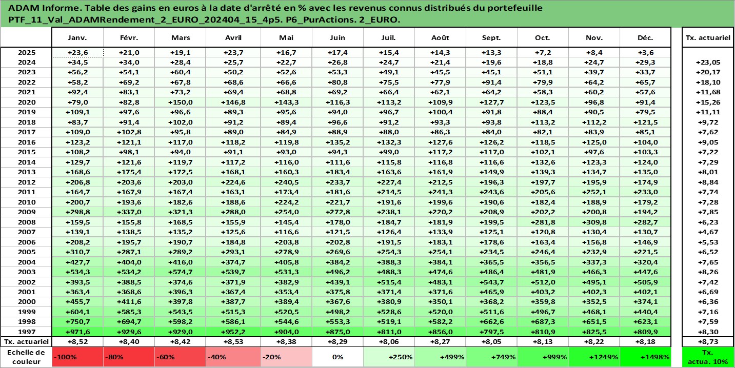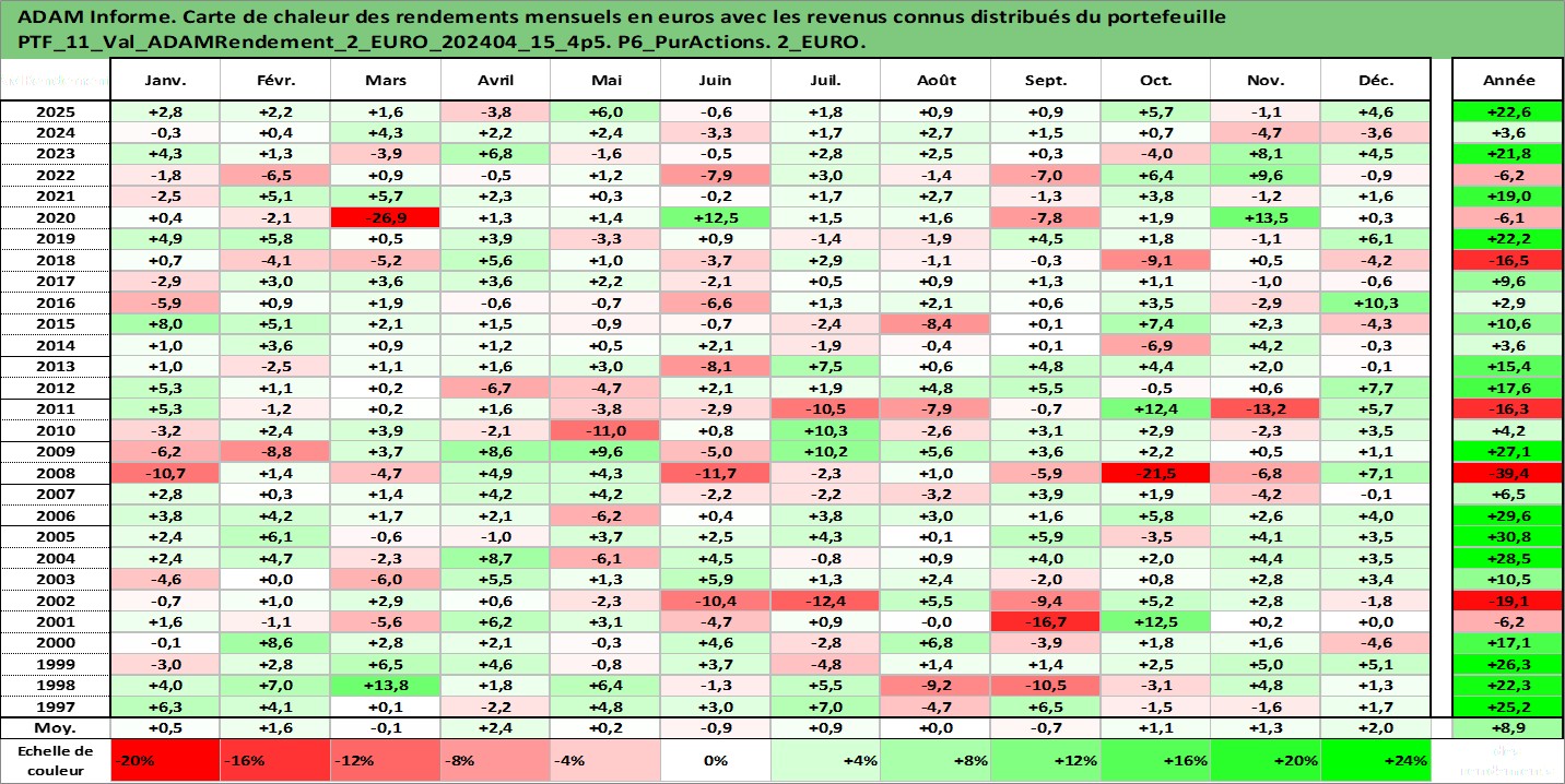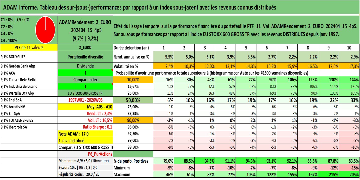 Site dédié aux investisseursPage dédiée sur site financeAnalyse des valorisations hebdomadaires du portefeuille ADAMRendement_2_EURO_202404_15_4p5_11actifs avec un profil P6_PurActions. Ce portefeuille est cote en EUR. Les valorisations couvrent les semaines 1997W01 a 2026W05. Les revenus de cet actif financier sont pris en compte depuis la semaine 1997W01. La note globale ESG de cet actif est estimee a 9.9 (apres rebasage entre 0 et 20).