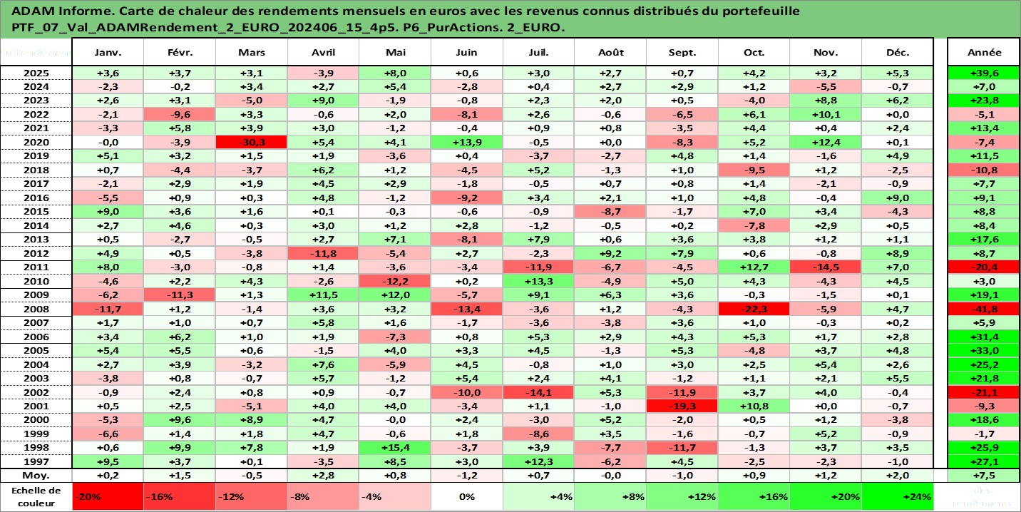 Site dédié aux investisseursPage dédiée sur site financeAnalyse des valorisations hebdomadaires du portefeuille ADAMRendement_2_EURO_202406_15_4p5_7actifs avec un profil P6_PurActions. Ce portefeuille est cote en EUR. Les valorisations couvrent les semaines 1997W01 a 2026W05. Les revenus de cet actif financier sont pris en compte depuis la semaine 1997W01. La note globale ESG de cet actif est estimee a 8.5 (apres rebasage entre 0 et 20).