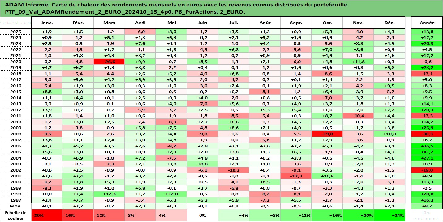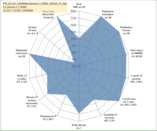 Site dédié aux investisseursPage dédiée sur site financeAnalyse des valorisations hebdomadaires du portefeuille ADAMRendement_2_EURO_202410_15_4p0_9actifs avec un profil P6_PurActions. Ce portefeuille est cote en EUR. Les valorisations couvrent les semaines 1997W01 a 2026W05. Les revenus de cet actif financier sont pris en compte depuis la semaine 1997W01. La note globale ESG de cet actif est estimee a 10.1 (apres rebasage entre 0 et 20).