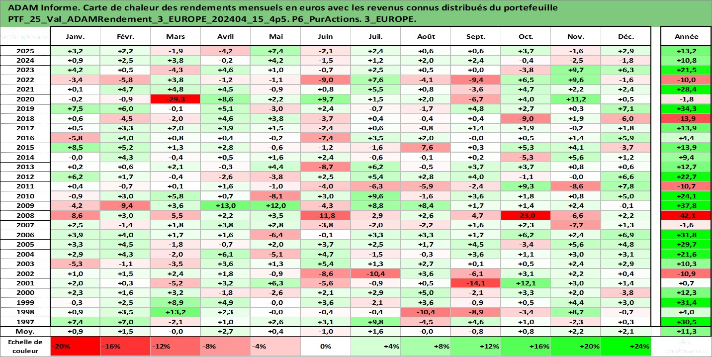 Site dédié aux investisseursPage dédiée sur site financeAnalyse des valorisations hebdomadaires du portefeuille ADAMRendement_3_EUROPE_202404_15_4p5_25actifs avec un profil P6_PurActions. Ce portefeuille est cote en EUR. Les valorisations couvrent les semaines 1997W01 a 2026W05. Les revenus de cet actif financier sont pris en compte depuis la semaine 1997W01. La note globale ESG de cet actif est estimee a 10.8 (apres rebasage entre 0 et 20).