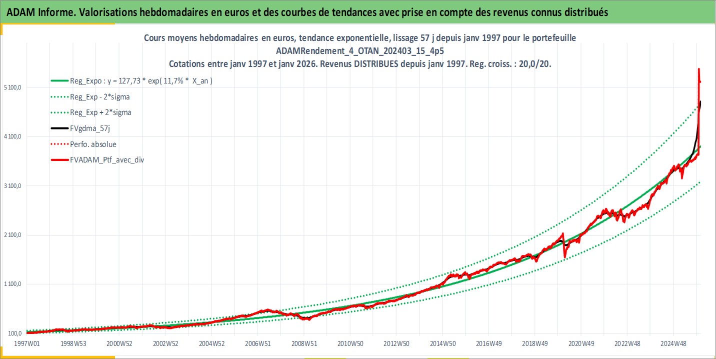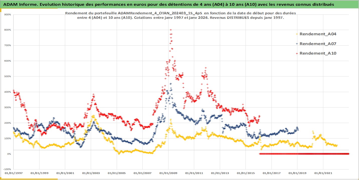 Site dédié aux investisseursPage dédiée sur site financeAnalyse des valorisations hebdomadaires du portefeuille ADAMRendement_4_OTAN_202403_15_4p5_53actifs avec un profil P6_PurActions. Ce portefeuille est cote en EUR. Les valorisations couvrent les semaines 1997W01 a 2026W05. Les revenus de cet actif financier sont pris en compte depuis la semaine 1997W01. La note globale ESG de cet actif est estimee a 10.1 (apres rebasage entre 0 et 20).