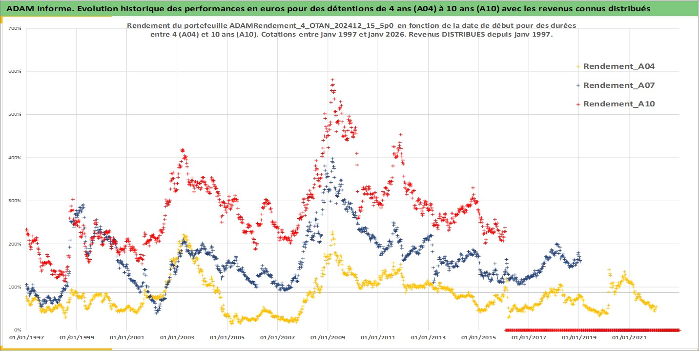 Site dédié aux investisseursPage dédiée sur site financeAnalyse des valorisations hebdomadaires du portefeuille ADAMRendement_4_OTAN_202412_15_5p0_24actifs avec un profil P6_PurActions. Ce portefeuille est cote en EUR. Les valorisations couvrent les semaines 1997W01 a 2026W05. Les revenus de cet actif financier sont pris en compte depuis la semaine 1997W01. La note globale ESG de cet actif est estimee a 11.7 (apres rebasage entre 0 et 20).