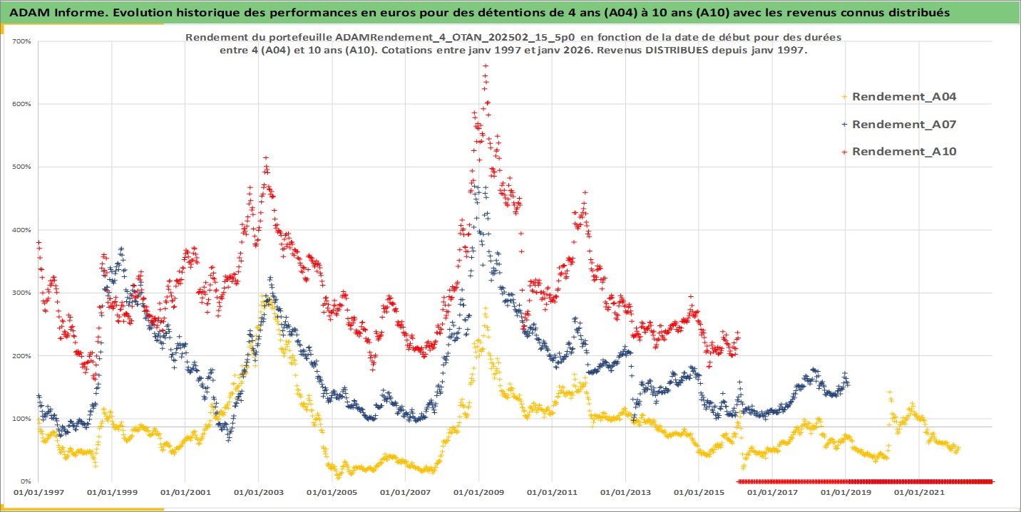 Site dédié aux investisseursPage dédiée sur site financeAnalyse des valorisations hebdomadaires du portefeuille ADAMRendement_4_OTAN_202502_15_5p0_29actifs avec un profil P6_PurActions. Ce portefeuille est cote en EUR. Les valorisations couvrent les semaines 1997W01 a 2026W05. Les revenus de cet actif financier sont pris en compte depuis la semaine 1997W01. La note globale ESG de cet actif est estimee a 11.0 (apres rebasage entre 0 et 20).