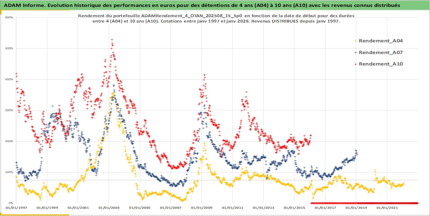 Site dédié aux investisseursPage dédiée sur site financeAnalyse des valorisations hebdomadaires du portefeuille ADAMRendement_4_OTAN_202508_15_5p0_17actifs avec un profil P6_PurActions. Ce portefeuille est cote en EUR. Les valorisations couvrent les semaines 1997W01 a 2026W05. Les revenus de cet actif financier sont pris en compte depuis la semaine 1997W01. La note globale ESG de cet actif est estimee a 12.4 (apres rebasage entre 0 et 20).