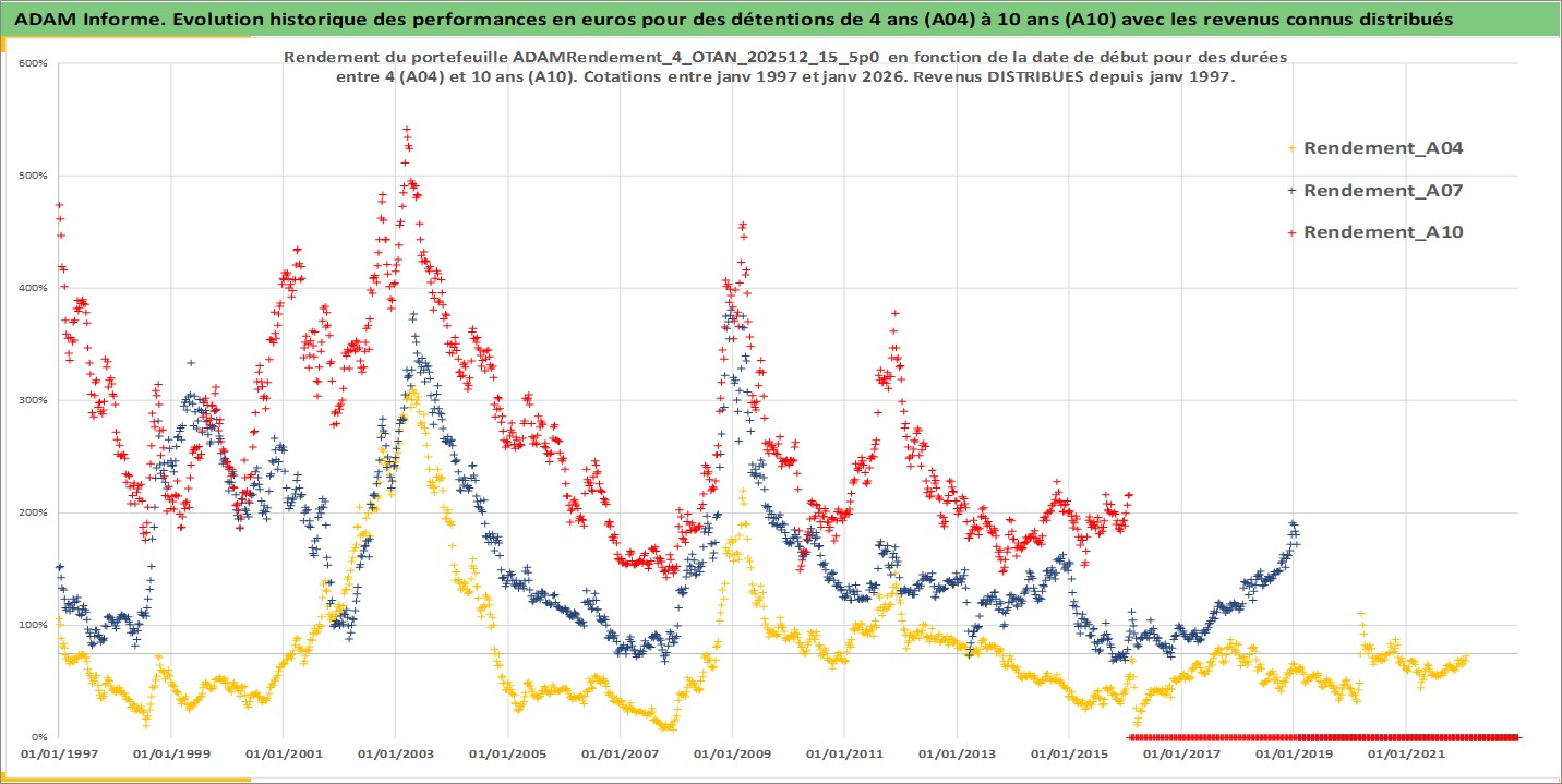 Site dédié aux investisseursPage dédiée sur site financeAnalyse des valorisations hebdomadaires du portefeuille ADAMRendement_4_OTAN_202512_15_5p0_17actifs avec un profil P6_PurActions. Ce portefeuille est cote en EUR. Les valorisations couvrent les semaines 1997W01 a 2026W05. Les revenus de cet actif financier sont pris en compte depuis la semaine 1997W01. La note globale ESG de cet actif est estimee a 11.9 (apres rebasage entre 0 et 20).