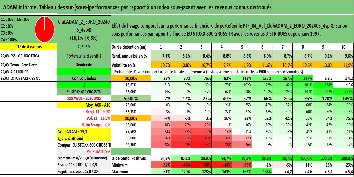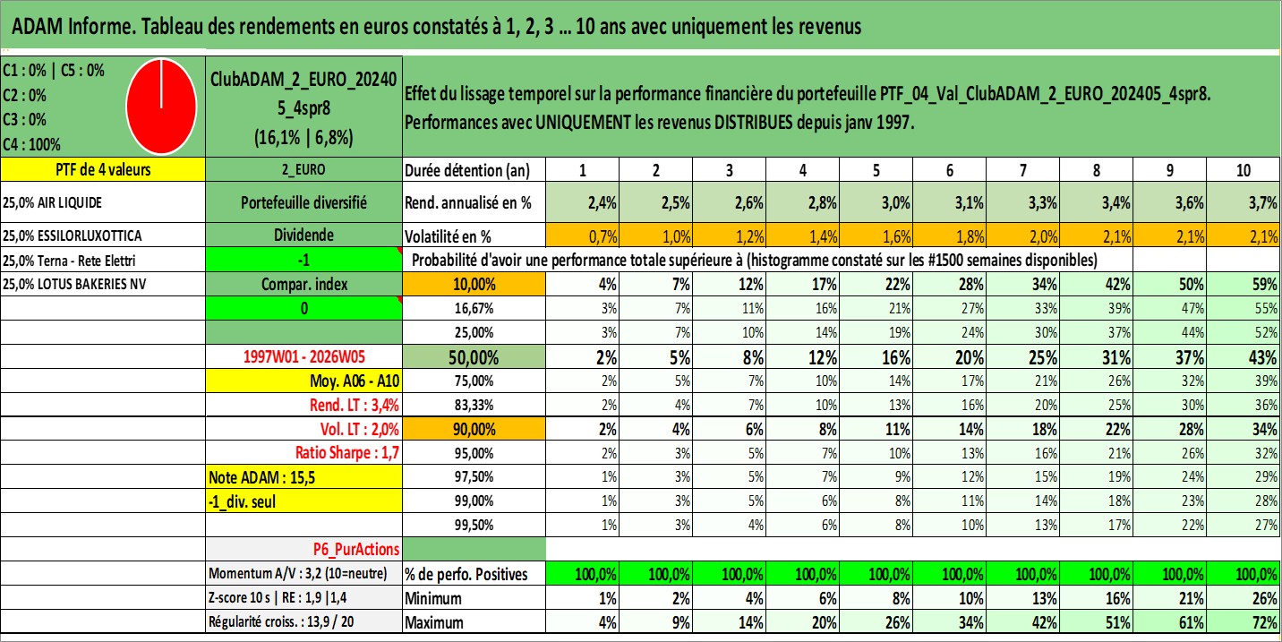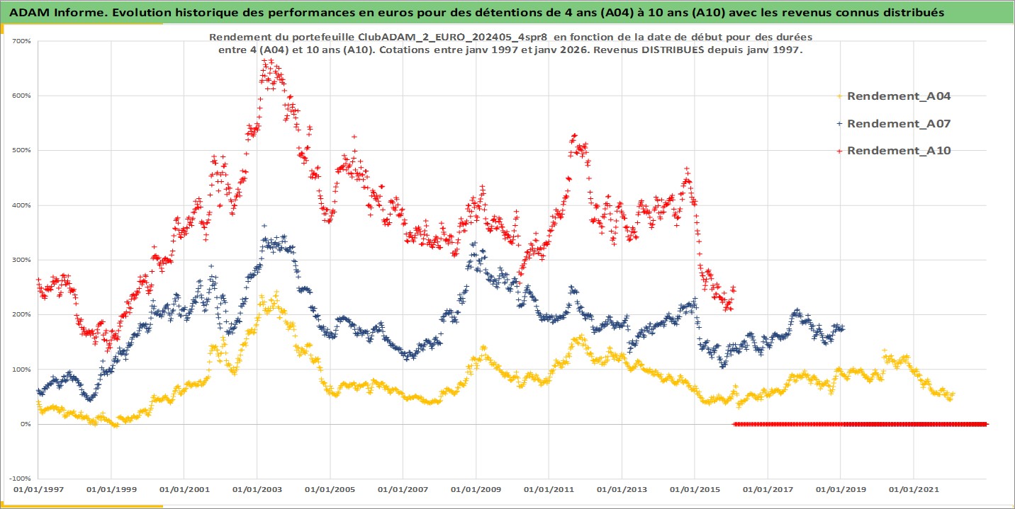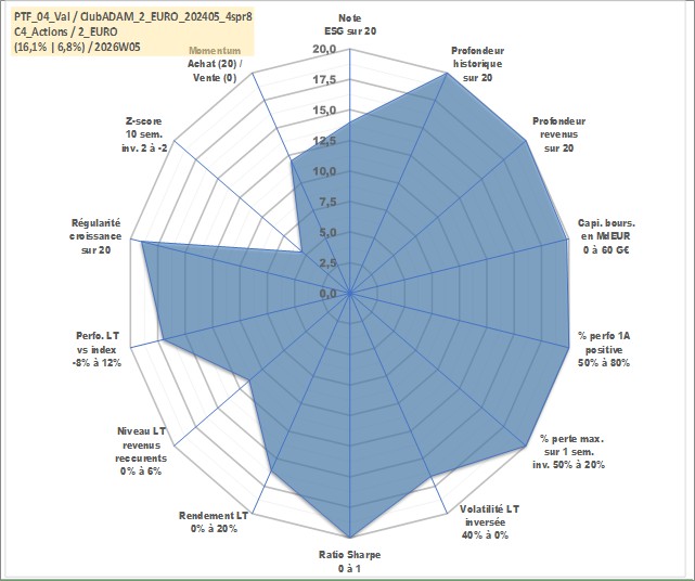 Site dédié aux investisseursPage dédiée sur site financeAnalyse des valorisations hebdomadaires du portefeuille ClubADAM_2_EURO_202405_4spr8_4actifs avec un profil P6_PurActions. Ce portefeuille est cote en EUR. Les valorisations couvrent les semaines 1997W01 a 2026W05. Les revenus de cet actif financier sont pris en compte depuis la semaine 1997W01. La note globale ESG de cet actif est estimee a 14.0 (apres rebasage entre 0 et 20).