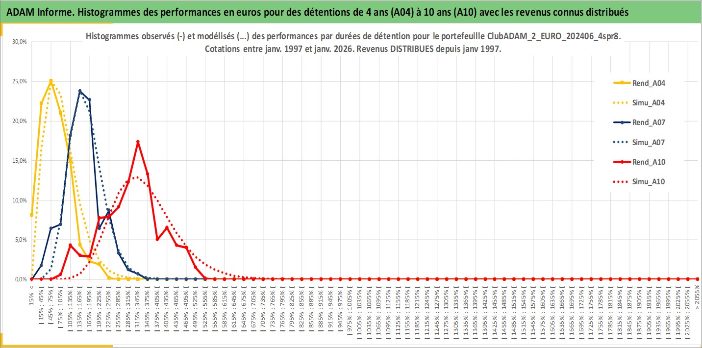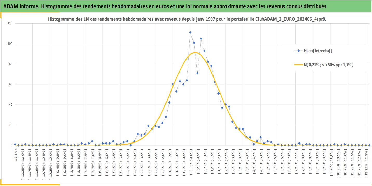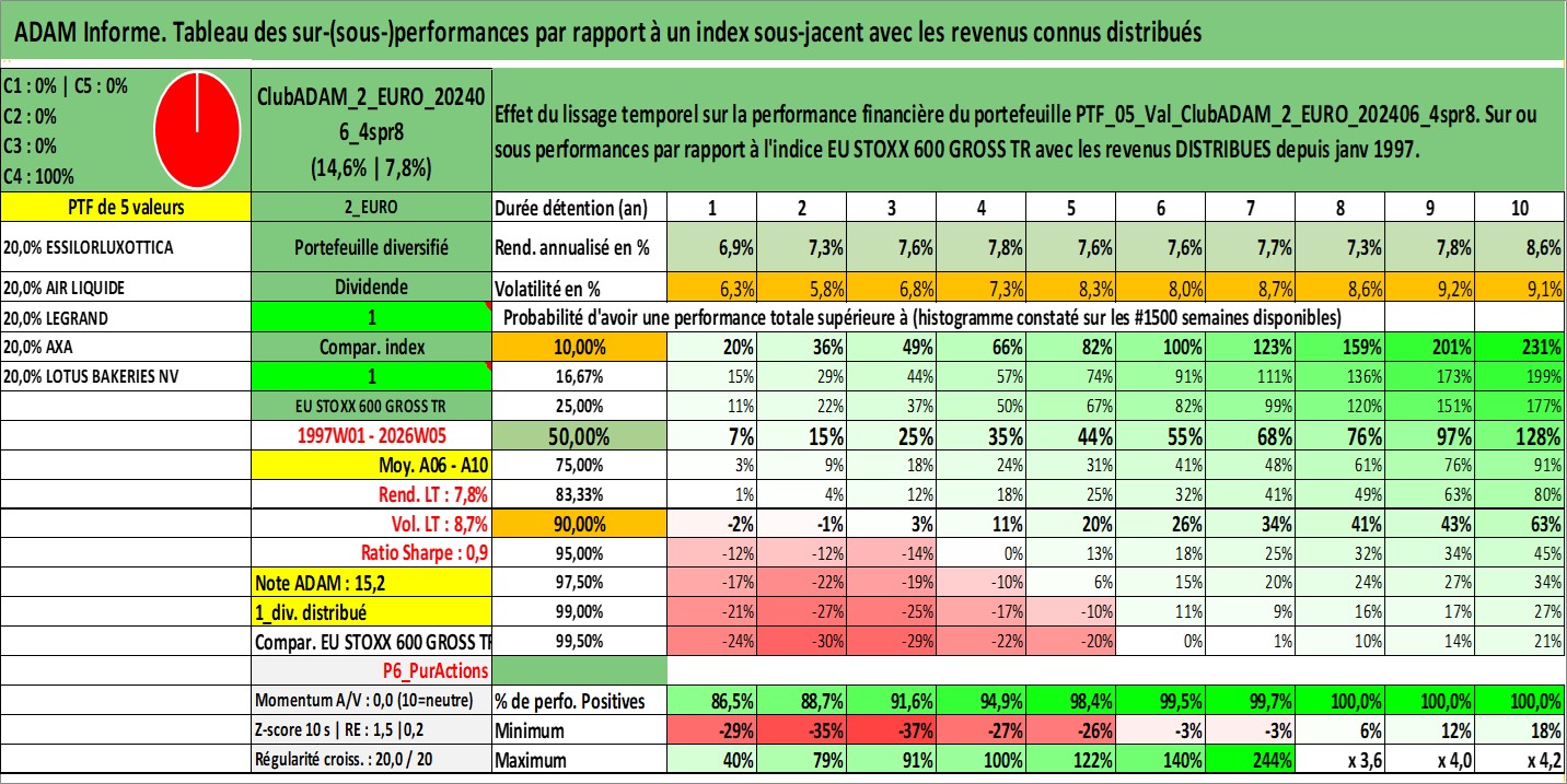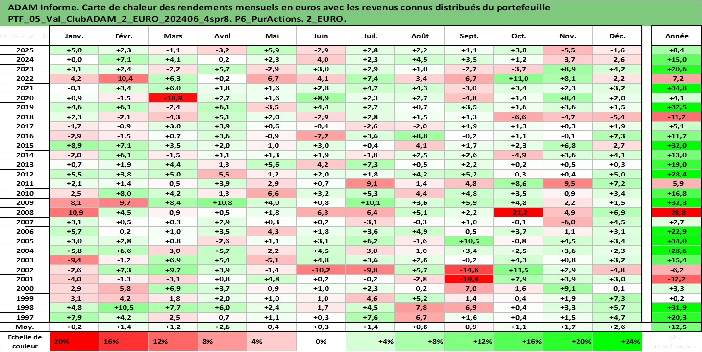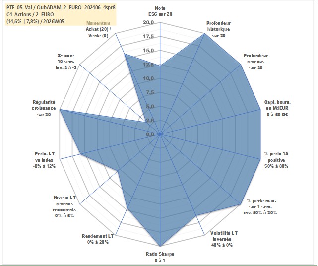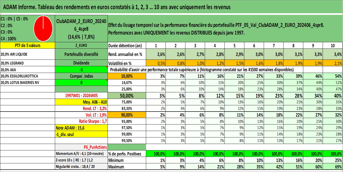 Site dédié aux investisseursPage dédiée sur site financeAnalyse des valorisations hebdomadaires du portefeuille ClubADAM_2_EURO_202406_4spr8_5actifs avec un profil P6_PurActions. Ce portefeuille est cote en EUR. Les valorisations couvrent les semaines 1997W01 a 2026W05. Les revenus de cet actif financier sont pris en compte depuis la semaine 1997W01. La note globale ESG de cet actif est estimee a 12.2 (apres rebasage entre 0 et 20).