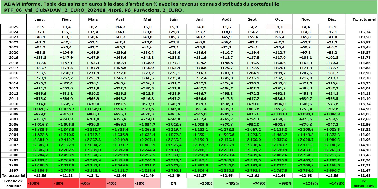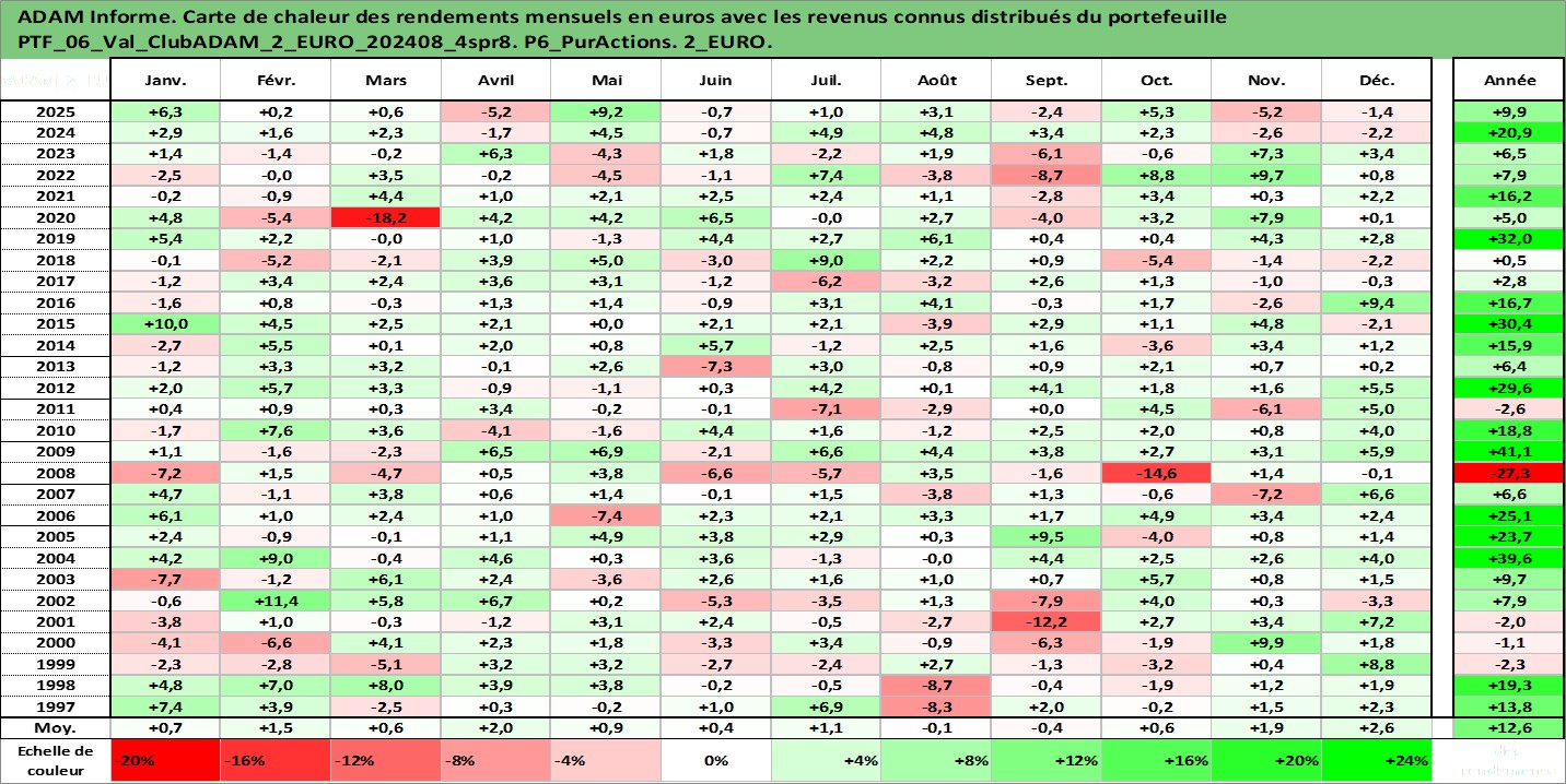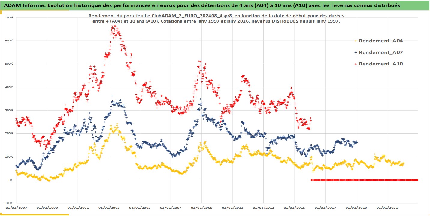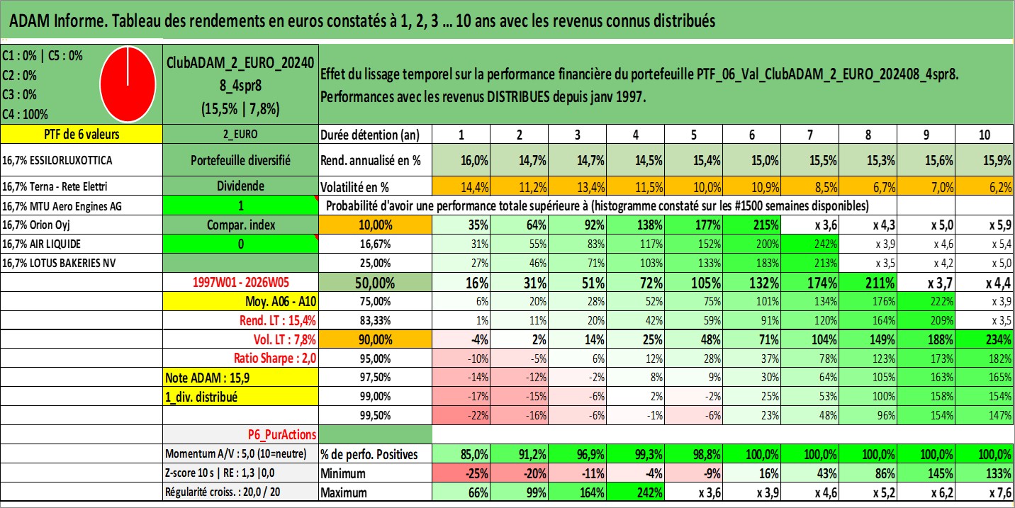 Site dédié aux investisseursPage dédiée sur site financeAnalyse des valorisations hebdomadaires du portefeuille ClubADAM_2_EURO_202408_4spr8_6actifs avec un profil P6_PurActions. Ce portefeuille est cote en EUR. Les valorisations couvrent les semaines 1997W01 a 2026W05. Les revenus de cet actif financier sont pris en compte depuis la semaine 1997W01. La note globale ESG de cet actif est estimee a 11.4 (apres rebasage entre 0 et 20).