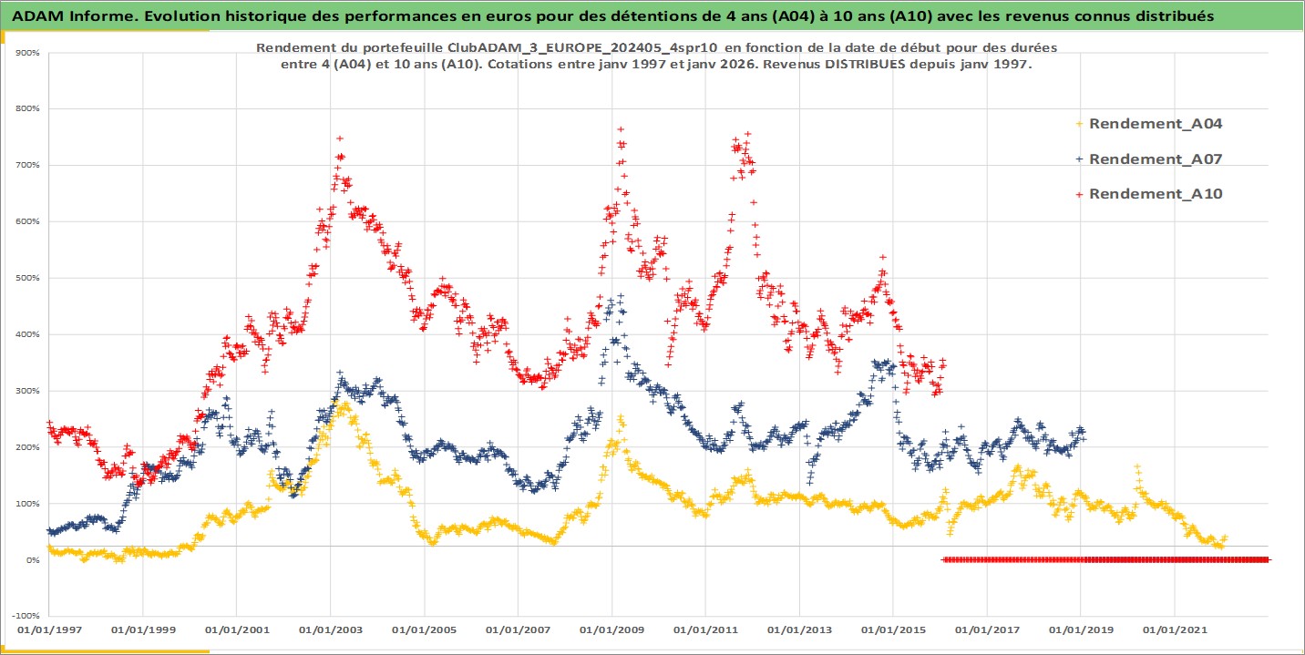 Site dédié aux investisseursPage dédiée sur site financeAnalyse des valorisations hebdomadaires du portefeuille ClubADAM_3_EUROPE_202405_4spr10_11actifs avec un profil P6_PurActions. Ce portefeuille est cote en EUR. Les valorisations couvrent les semaines 1997W01 a 2026W05. Les revenus de cet actif financier sont pris en compte depuis la semaine 1997W01. La note globale ESG de cet actif est estimee a 13.3 (apres rebasage entre 0 et 20).